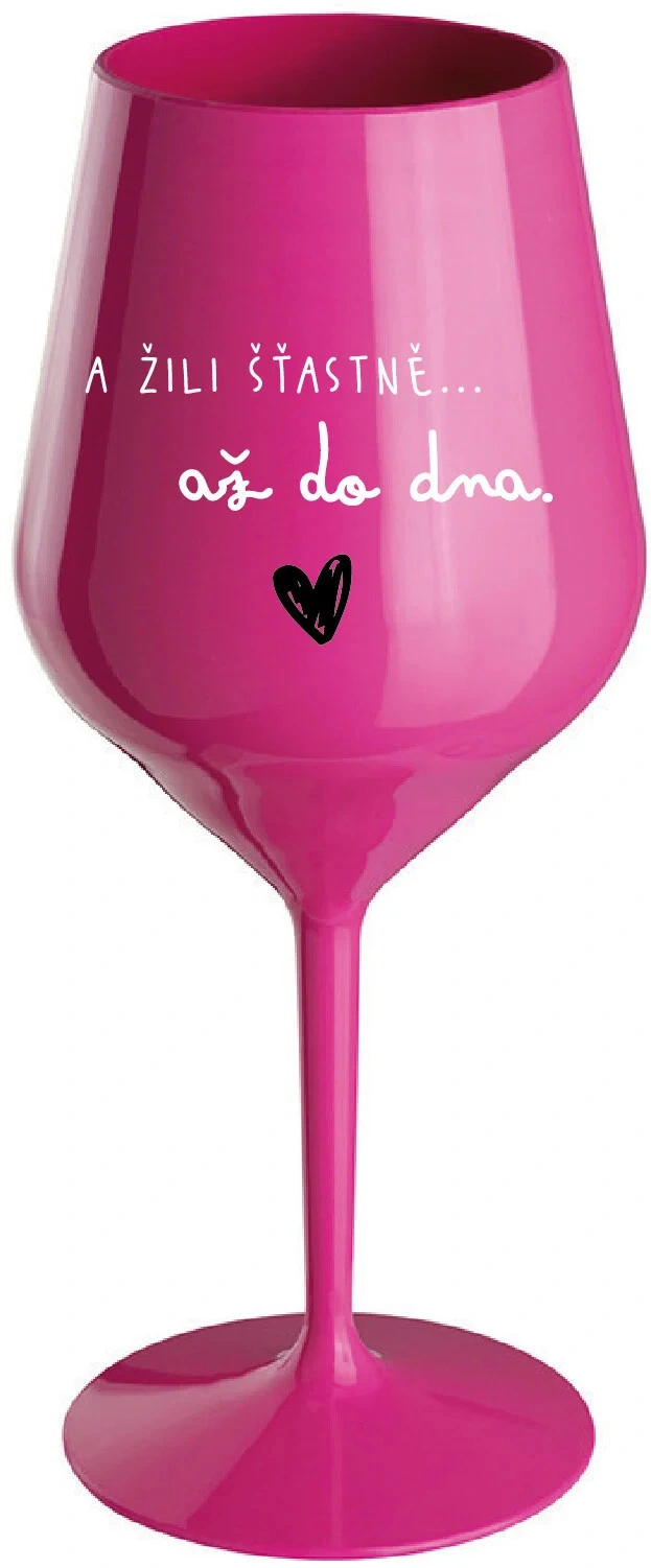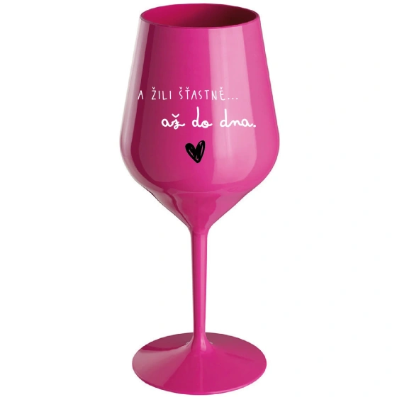 Nerozbitná růžová vinná sklenice s motivem A ŽILI ŠŤASTNĚ AŽ DO DNA je skvělá na zahradu, pláž, výlet, piknik a parádu udělá i při kempování. Jelikož je vyrobená z kvalitního polykarbonátu je de facto nerozbitná. Je to luxusní kousek, s nímž si víno můžete vychutnat prostě kdekoliv. Mají ergonomický tvar, který příjemně padne do ruky a protože je lehká, usnadňuje to její přenášení. Je snadno skladovatelná a lehce se čistí. Díky svému designu si s ní můžete vychutnat doopravdy kdekoliv bezproblémové pití výborného vína. Materiál PP. Vyrobené s láskou v ČR