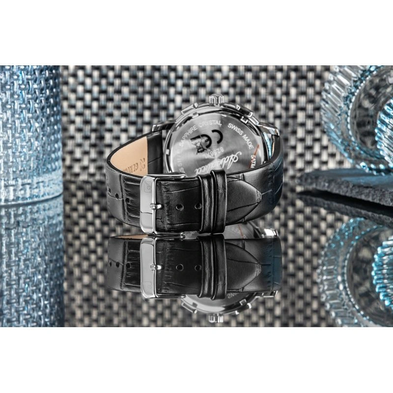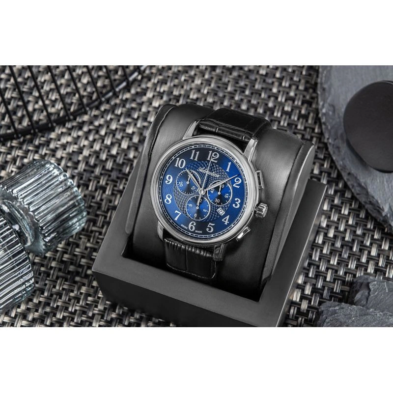 Kompozice ciferníku, založená na klasickém uspořádání tří ručiček - hodinové, minutové a vteřinové -, zaujme svou přehledností a vyvážeností tvaru. Každý detail - od proporcí číslic, viditelnosti chronografu až po jemný pohyb ručiček - prozrazuje řemeslnou preciznost švýcarských hodinek, kde forma a obsah jdou ruku v ruce a vytvářejí styl, který odolává módním výstřelkům.