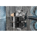 Střední část ciferníku, na níž jsou uspořádány dílčí ciferníky chronografu, vytváří efekt hloubky a pohybu, díky čemuž si světlo pohrává s povrchem při každém otočení zápěstí. Hladký, kovově třpytivý rámeček s přehlednými arabskými číslicemi a minutovými stupnicemi vytváří jasný kontrast - zdůrazňuje precizní zpracování a pozornost věnovanou detailům.