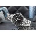 Męski zegarek Adriatica A8307.5114Q to esencja nowoczesnej elegancji zaklęta w głębokiej czerni, która przyciąga wzrok szlachetnym minimalizmem i siłą wyrazu. Jego czarna tarcza o wyrafinowanym, matowym wykończeniu została wzbogacona o subtelny pierścień z oznaczeniami 24-godzinnymi, nadając całości funkcjonalnej głębi i charakterystycznej struktury. Model ten wyposażono w cztery wskazówki – w tym dodatkową GMT zakończoną czerwonym grotem – co umożliwia jednoczesne śledzenie czasu w drugiej strefie czasowej lub w trybie 24h. To rozwiązanie praktyczne, a zarazem estetyczne, podkreślające dynamiczny, męski styl życia. Wskazówki główne i indeksy godzinowe pokryto warstwą luminescencyjną, gwarantując doskonałą czytelność niezależnie od pory dnia. Harmonijnie wkomponowany datownik przy godzinie trzeciej zapewnia praktyczną funkcję bez zaburzania symetrii cyferblatu. Całość chroniona jest przez wysokiej klasy szkło szafirowe, odporne na zarysowania – rozwiązanie,
