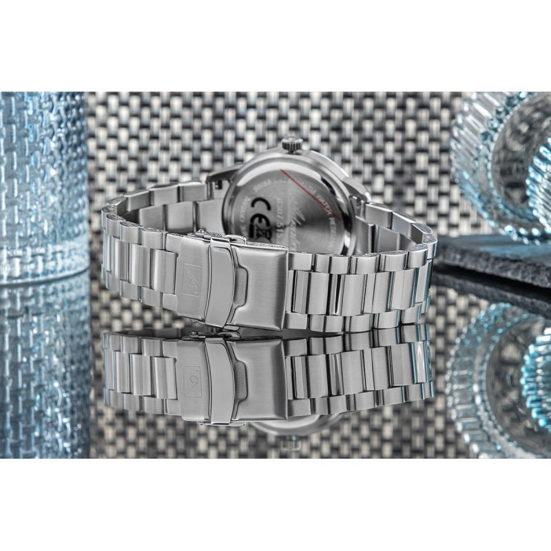 Vyroben z vynikající ušlechtilé oceli, která kombinuje odolnost s luxusní povrchovou úpravou Jeho robustní konstrukce je nejen zárukou spolehlivosti, ale také jistotou, že hodinky budou perfektně ležet, ať už den přinese cokoli. Vzhled doplňuje precizní spona s vyraženým logem, která hodinkám dodává punc noblesy a jedinečnosti.
