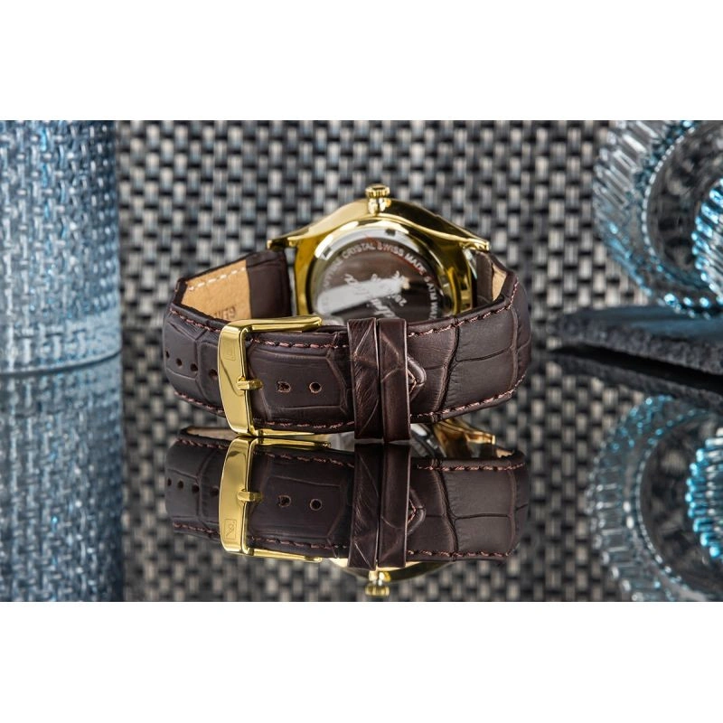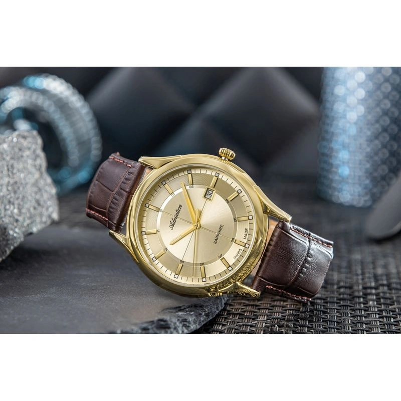 Męski Zegarek Adriatica A2804.1211Q to szwajcarska precyzja ubrana w stal i skórę. Tarcza w kolorze szampana, złote indeksy i elementy z luminescencją – wszystko, czego potrzeba, żeby robić swoje. W jego sercu bije niezawodny, kwarcowy mechanizm Swiss Made – precyzyjny, solidny, stworzony po to, by działać bez zarzutu przez długie lata, bez względu na to, jak atywny jesteś podczas dnia. Trzy wskazówki – godzinowa, minutowa i sekundowa – płynnie przesuwają się po eleganckiej tarczy tworzą harmonijną całość, udowadniając, że prawdziwa klasa tkwi w prostocie. Odporne na zarysowania szafirowe szkło skutecznie chroni to, co najważniejsze. 42-milimetrowa koperta ze stali nierdzewnej została zaprojektowana tak, by dobrze leżała na nadgarstku, nie dominując go, ale będąc wyrazistym elementem całości. Całość dopełnia klasyczny, brązowy pasek ze skóry naturalnej, który z czasem nabierze jeszcze więcej charakteru. To model, który dobrze leży na nadgarstku, pasuje do gar