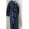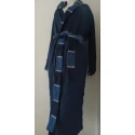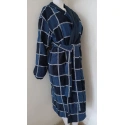 Pánský dlouhý luxusní župan se šálovým límcem . Je ve vzoru tmavě modré a světle modré kostky z vnitřní strany a tmavě modré klasické látky z vrchní strany. Župan je možné obrátit a použít vzorovanou část jako vrchní stranu. V pase na zavazování. Na tmavě modré straně jsou našité kapsy.