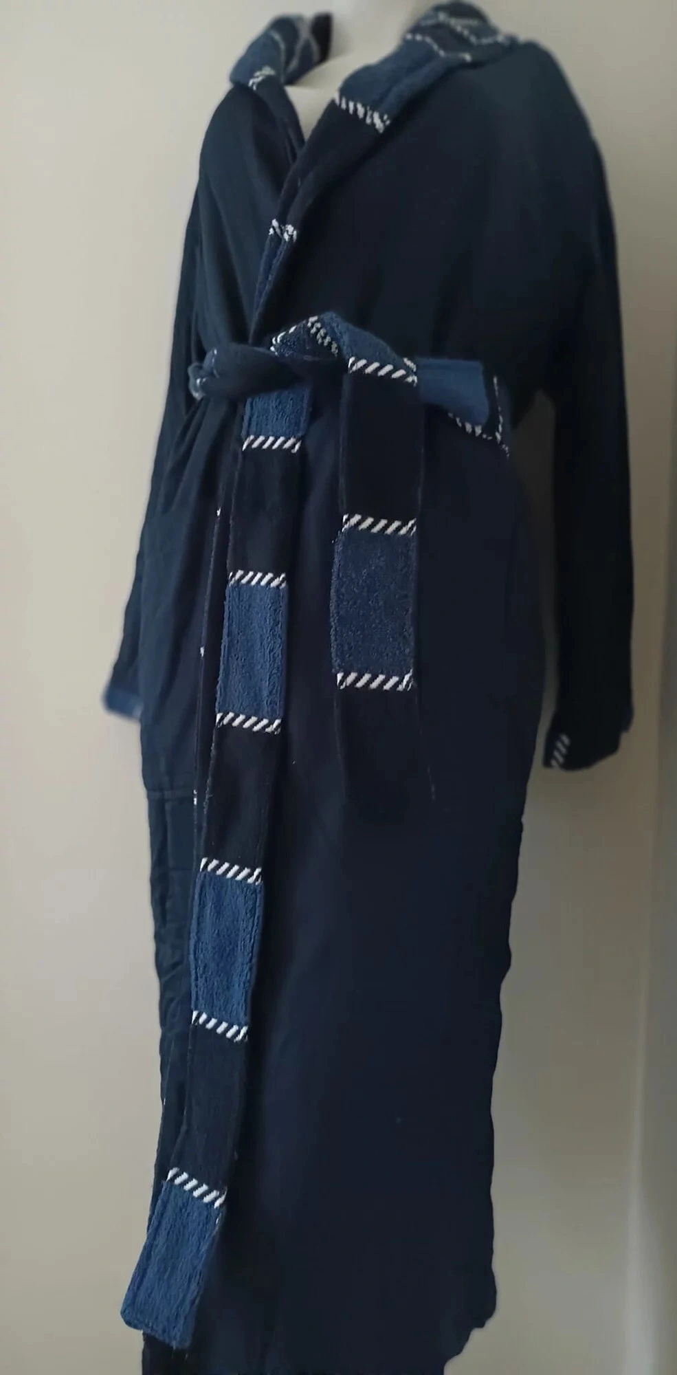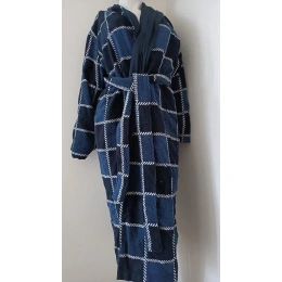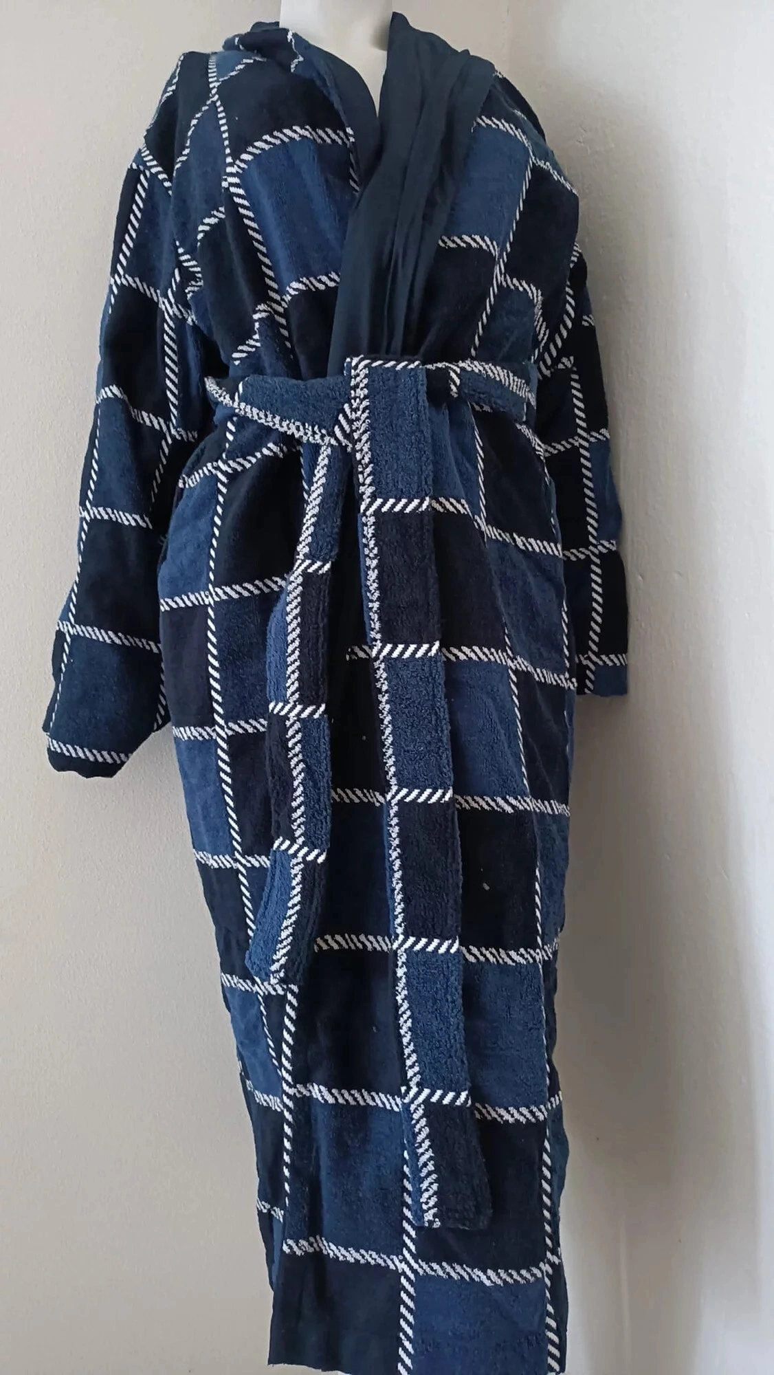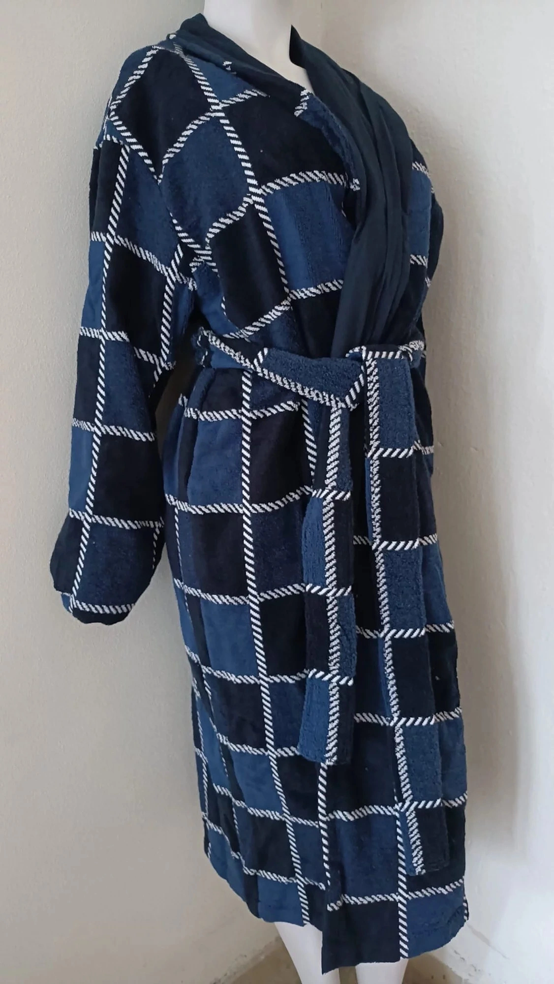 Pánský dlouhý luxusní župan se šálovým límcem . Je ve vzoru tmavě modré a světle modré kostky z vnitřní strany a tmavě modré klasické látky z vrchní strany. Župan je možné obrátit a použít vzorovanou část jako vrchní stranu. V pase na zavazování. Na tmavě modré straně jsou našité kapsy.