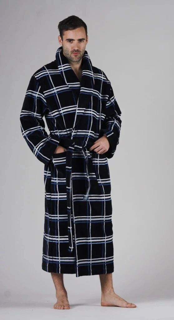 Dlouhý pánský bavlněný župan, tmavě modré kostky s bílými a světle modrými pruhy, 510g/m2.