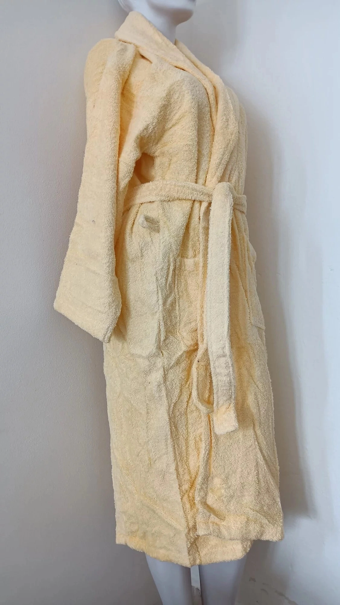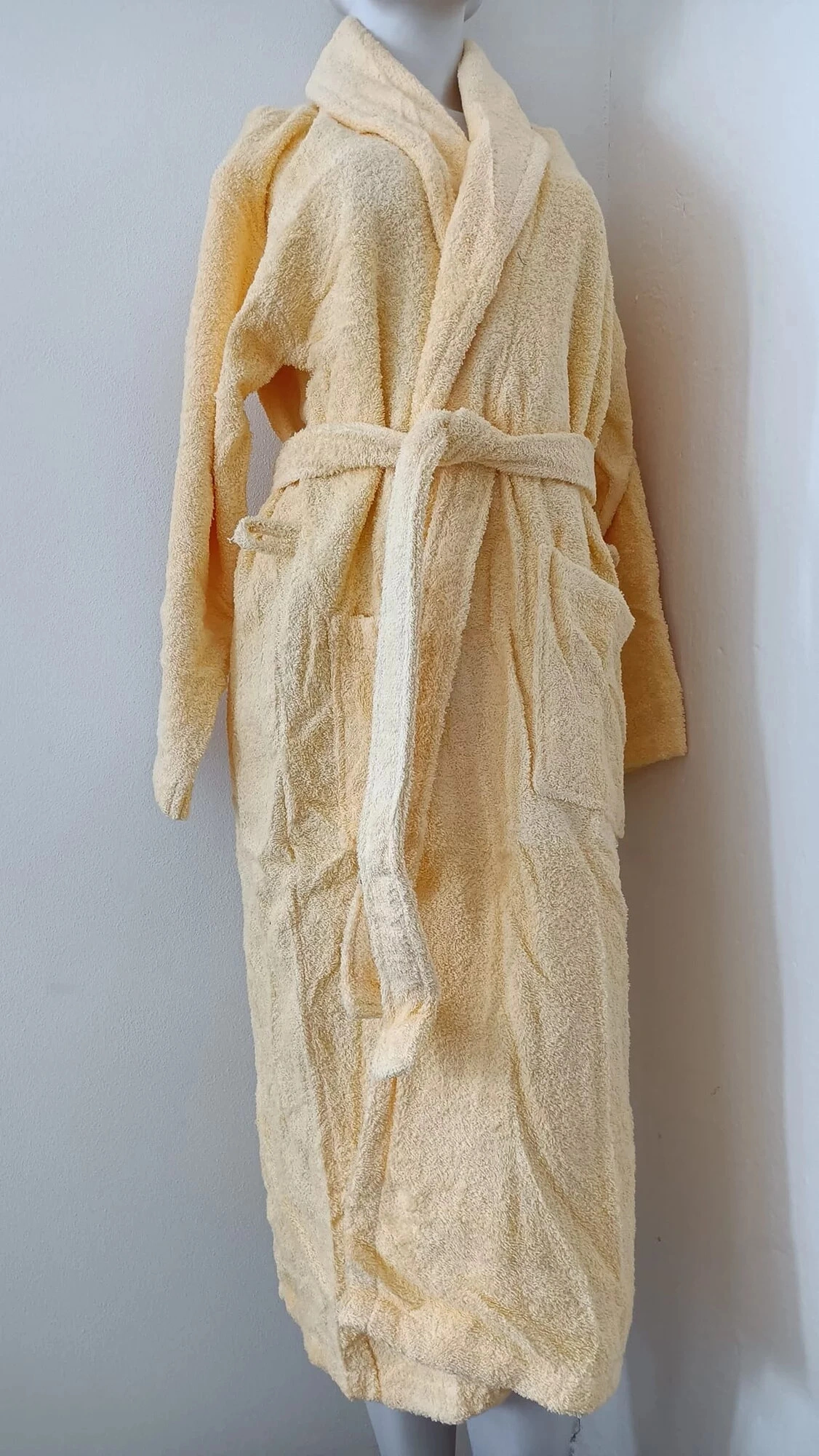 Župan má univerzální střih s kapsami a šálovým límcem a páskem.