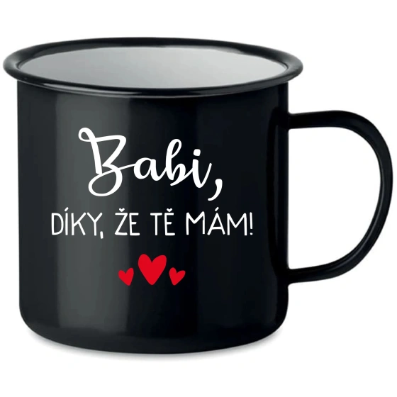 Smaltovaný Plecháček pro Chvíle Pohody - S Úsměvem a Teplem V našem rychlém světě je důležité najít si chvilku klidu a pohody. Naše nová kolekce smaltovaných plecháčků je jako stvořená právě pro tyto momenty. Každý plecháček je vyroben s láskou a pečlivostí, aby doprovázel vaše chvíle odpočinku, ať už si vychutnáváte šálek voňavé kávy, lahodného čaje nebo teplého kakaa. S objemem 350 ml jsou tyto tradiční smaltované hrnky perfektními společníky pro každý den. A co je na nich nejlepší? Každý z nich nese vtipný motiv: BABI, DÍKY, ŽE TĚ MÁM!, který rozjasní váš den a přinese úsměv na tvář. Tyto hrnky jsou jako malé pohlazení pro duši - ideální pro chvíle, kdy jste sami sebou, nebo pro ty nezapomenutelné okamžiky strávené s vašimi nejbližšími. Zapomeňte na chvíli na všechny starosti a užijte si klidný moment s naším smaltovaným plecháčkem. Objednejte si jej nyní a připravte se na maximální požitek z každého doušku! Doporučujeme ruční mytí tohoto produktu pro zachování jeho kvality a trvanlivosti. Nedoporučujeme umisťovat do myčky na nádobí.