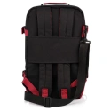 • Konstrukce batohu zahrnuje ergonomické zapínání a nastavitelné výztuhy, které umožňují individuální přizpůsobení postavě uživatele. Výztuhy jsou polstrované pěnovými panely, což zlepšuje cirkulaci vzduchu a snižuje tlak na ramena. Díky přídavným popruhům navíc tato funkce umožňuje flexibilní správu prostoru v závislosti na množství zavazadel, která se mají vzít s sebou.