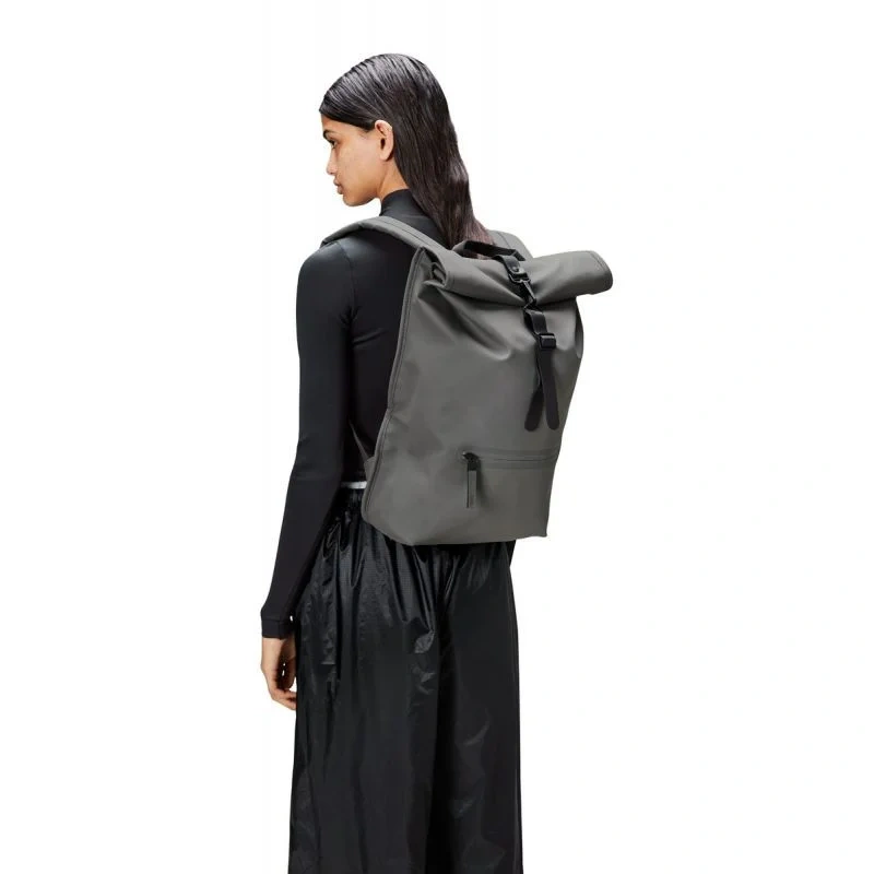 - Batoh Rolltop je vyroben z charakteristické voděodolné PU tkaniny Rains, která je navržena pro pevnost, odolnost a hladkost.