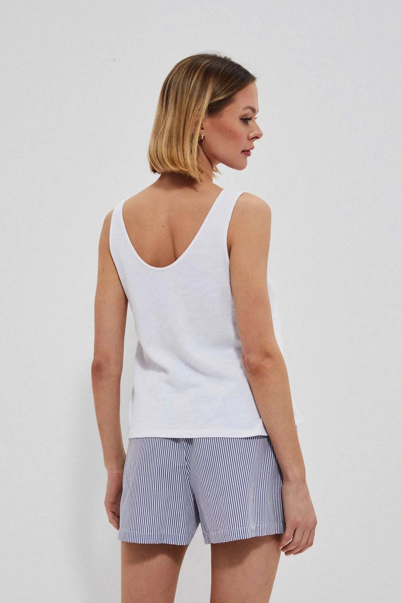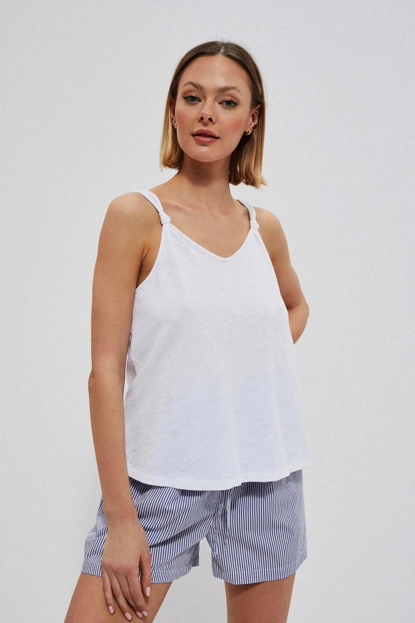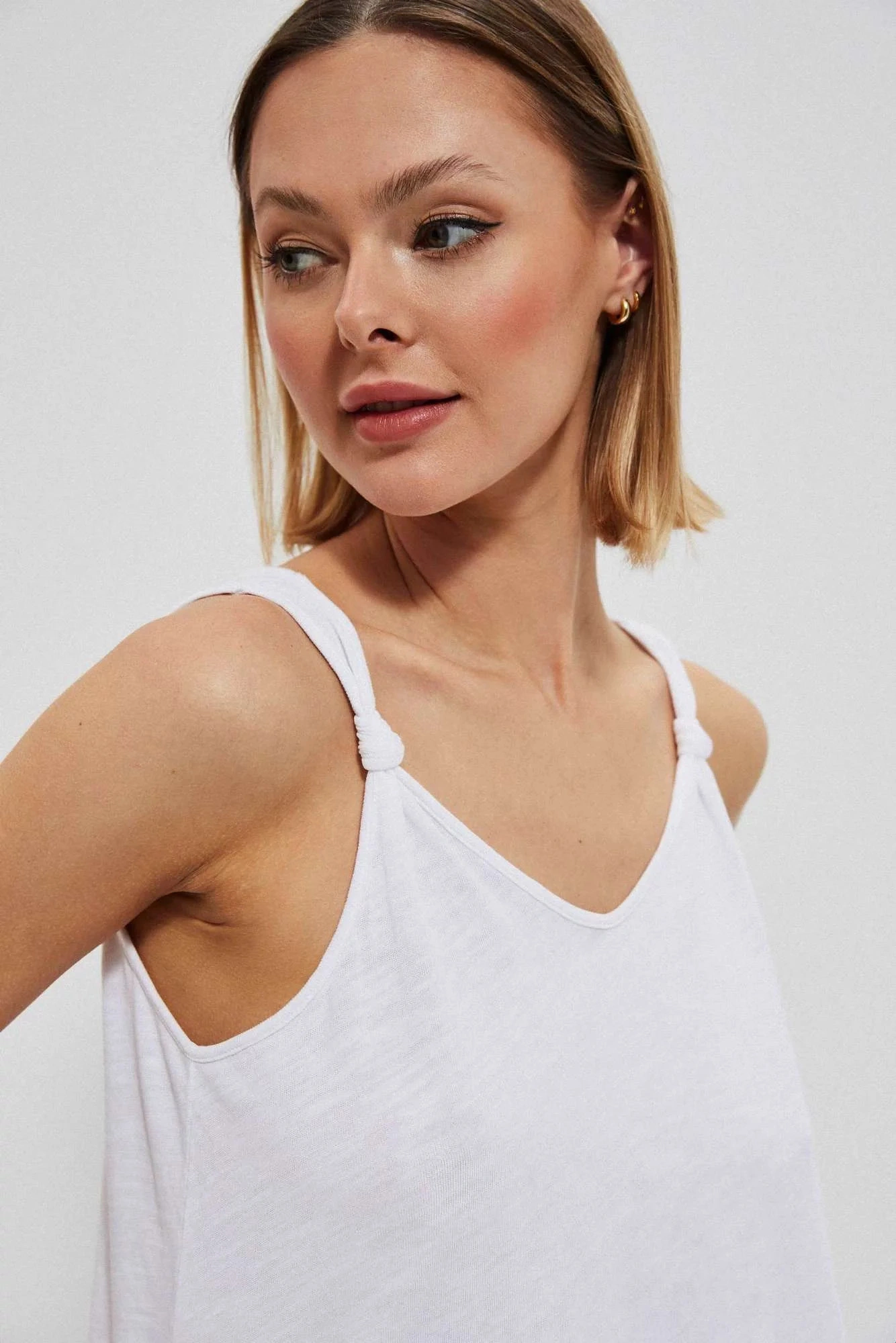 100% BAVLNA Top v bílé barvě, hladký a bez vzorů. Výstřih do V. Popruhy se zavázaným sloupkem. Volný a široký střih. Perfektní nápad na léto!