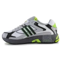 Svršek boty inspirovaný retro stylem je vyroben z vrstvené směsi síťoviny a syntetické kůže, dokončené v bílé a šedé barvě a zvýrazněné zelenými akcenty.