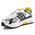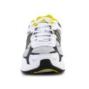 Svršek boty inspirovaný retro stylem je vyroben z vrstvené směsi síťoviny a syntetické kůže, dokončené v bílé a šedé barvě a zvýrazněné žlutými akcenty.