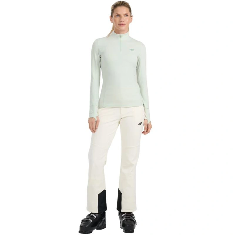 Bluza termoaktywna damska 4F F098 miętowa 4FWAW25UBRUF098 47S Ocieplana bluza termiczna damska 4F łączy w sobie wszystkie paramenty poszukiwane przez zwolenniczki aktywności w plenerze nawet podczas mroźnych, zimowych dni. Dane techniczne:· Materiał główny: 90% poliester, 10% elastan· Technologia 4FWarm na zimne dni -pomaga utrzymać stałą temperaturę ciała w każdych warunkach· Odprowadzanie wilgoci 4FDry - szybkoschnące włókna wspierają suchość i komfort podczas aktywności· Idealna jako druga warstwa - sprawdza się jako docieplenie noszone na koszulkę lub pod kurtkę· Ciepłe, czesane wnętrze - miękka dzianina dobrze grzeje i sprawdza się jako druga warstwa· Dopasowany krój slim - przylega do ciała, nie krępuje ruchów i wygodnie się nosi· Rozciągliwy materiał z elastanem - elastyczność zapewnia swobodę ruchów i dopasowanie do sylwetki· Stójka z zamkiem i blokadą - dodatkowa ochrona szyi i wygodna regulacja temperatury· Mankiety z otworem na kciuk - rękawy nie