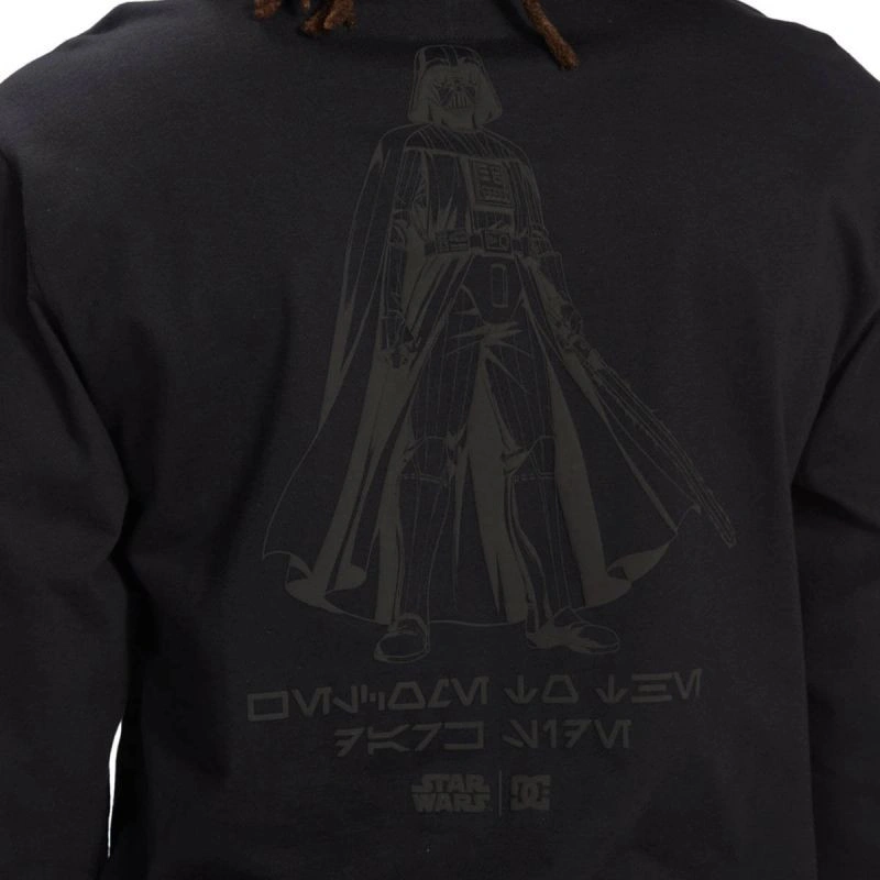 Mikina inspirovaná ikonickou černou zbrojí Dartha Vadera™ , kapsa ze síťoviny a zapínání na zip na hrudi decentně vzdávají hold designu Vaderova obleku, zatímco černočerný potisk na zádech zobrazuje samotného sithského lorda spolu s nápisem Aurebesh a logem Star Wars™ X DC Shoes Collection.