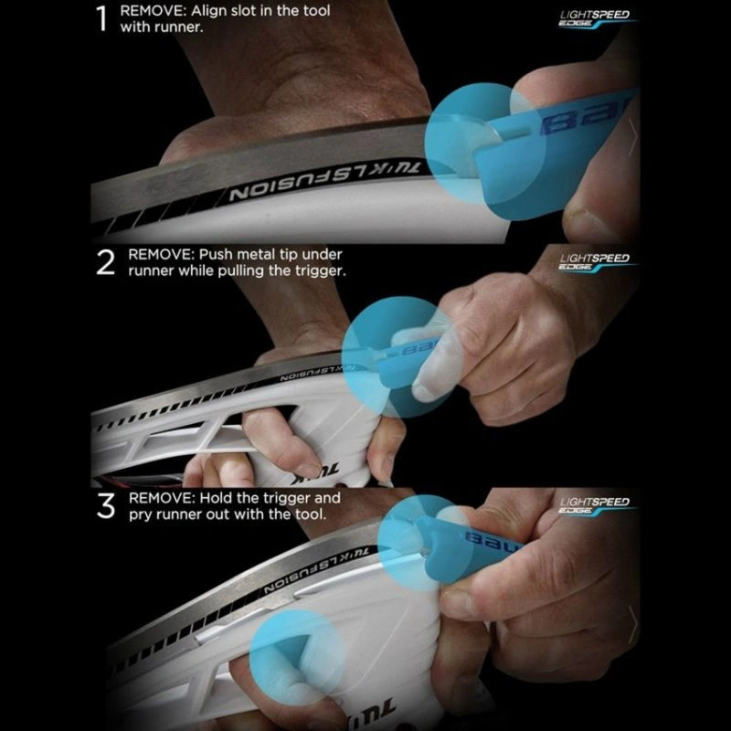 Skluznice se prodává samostatně, levá a pravá Vyšší profil skluznice než u modelu Lightspeed 2, který pomáhá brusli lépe zatáčet a rychleji vyjíždět ze zatáček Skluznice má systém rychlé výměny nožů Pasují pouze nože EDGE Skluznice má až o 7 % kratší poloměr zatáčení Kratší poloměr zatáčení znamená rychlejší kontrolu nad pukem Skluznice Lightspeed EDGE je vyšší než skluznice Lightspeed 2. To má za následek nižší polohu brusle vůči ledu při zatáčení, agresivnější úhel a umožňuje brusli rychleji vyjíždět ze zatáček a těsněji zatáčet.