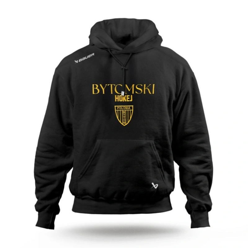 Bluza Bytomski Hokej -Haft Styl, duma i komfort dla fanów Polonii Bytom Bluza Bytomski Hokej to obowiązkowy element garderoby każdego kibica klubu hokejowego Polonii Bytom! Klasyczna czarna bluza z kapturem łączy sportowy charakter z codziennym komfortem. Z przodu znajduje się efektowny haft „BYTOMSKI HOKEJ” w złotym kolorze oraz herb klubu Polonia Bytom – symbol dumy i tradycji bytomskiego hokeja. Główne cechy: Wysokiej jakości materiał: Wykonana z miękkiej mieszanki 65% poliestru i 35% bawełny – idealna na chłodne dni, zarówno na trybunach, jak i poza nimi. Sportowy design Bauer: Nowoczesny krój i stylowe logo producenta na ramieniu. Efektowny haft klubowy: Napis „BYTOMSKI HOKEJ” i herb Polonii Bytom w kontrastującym złotym kolorze. Funkcjonalny kaptur i kieszeń kangurka: Idealne rozwiązanie na chłodniejsze dni. Uniwersalny styl: Swietnie sprawdzi się zarówno na trybunach, jak i w codziennym użytkowaniu. Bluza Bytomski Hokej - Haft to połączenie sportowej elegancj