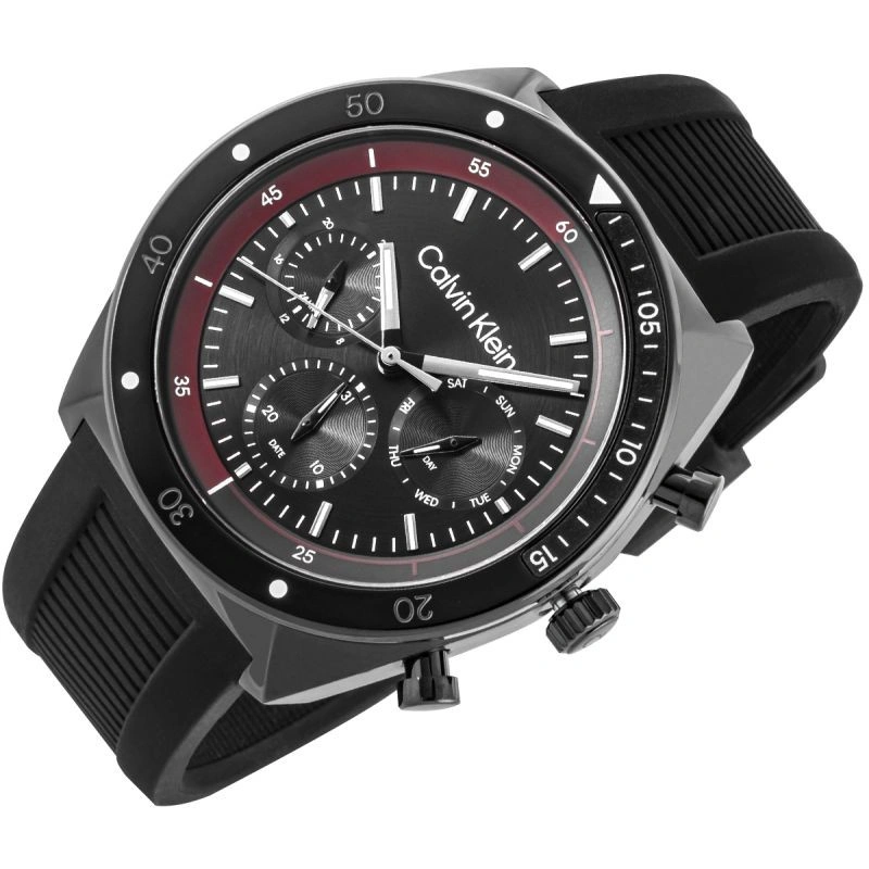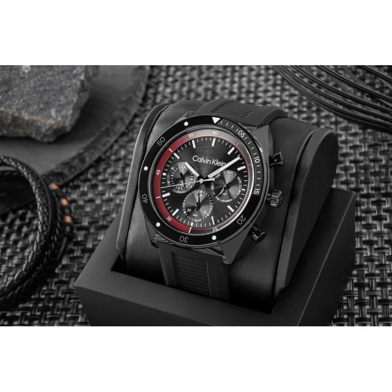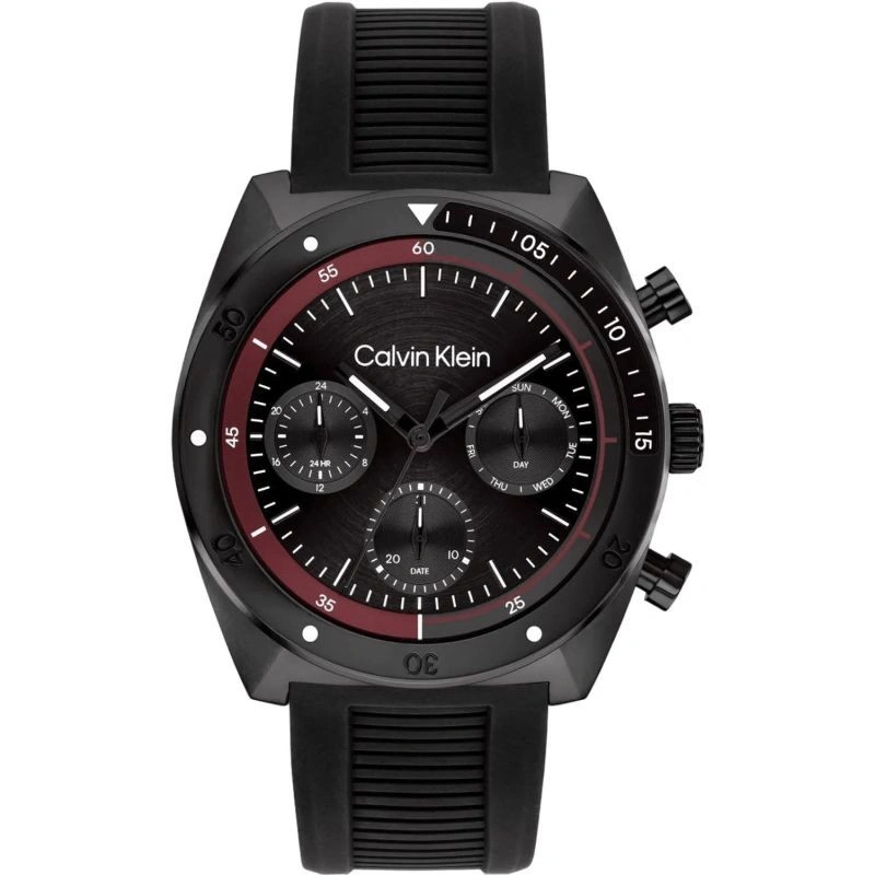 Model CALVIN KLEIN CK Flex je manifestem městského stylu s nádechem adrenalinu. Kontrast černého ciferníku a vínového rámečku buduje vizuální napětí, jako by se hodinky chystaly vzlétnout. Na ciferníku najdete tři dílčí ciferníky: 24hodinový režim, ukazatel data a ukazatel dne v týdnu - všechny jsou umístěny tak, aby byly intuitivně čitelné a vyvážené. Pevný rámeček a výrazná tlačítka umocňují sportovní a zároveň sofistikovaný dojem hodinek. Vzhled dotváří gumový řemínek s drážkami, který nabízí pohodlné nošení - sportovní, praktické, ale přesto elegantní. Hodinky CALVIN KLEIN CK Flex jsou hodinky, které najdou své dokonalé uplatnění u pracovního stolu, během dynamických schůzek i večer - během klidného času pro sebe.