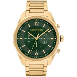 Model CALVIN KLEIN CK Force To projekt, który wybrzmiewa ciszą luksusu. Gładka, szczotkowana stal w odcieniu szampańskiego złota łączy się tu ze szmaragdową tarczą o dynamicznym efekcie sunray, który zmienia się zależnie od światła – niczym dobrze skalibrowany wyświetlacz. Geometryczna forma koperty w połączeniu ze szczotkowaną powierzchnią robi efekt „wow” bez zbędnego błysku. Trzy subtarcze odpowiadają za funkcję 24-godzinnego trybu, datownika oraz dnia tygodnia, zapewniając pełną kontrolę nad czasem. Ich układ został zaprojektowany tak, by zachować czytelność i równowagę wizualną całej tarczy. Całość zamyka solidna koperta z precyzyjnym bezelem, który podkreśla nowoczesny, męski styl. To zegarek, który płynnie przechodzi między biurem, spotkaniem biznesowym a wieczorem przy winie – bez zbędnych kompromisów. Zawsze z klasą, zawsze na poziomie.