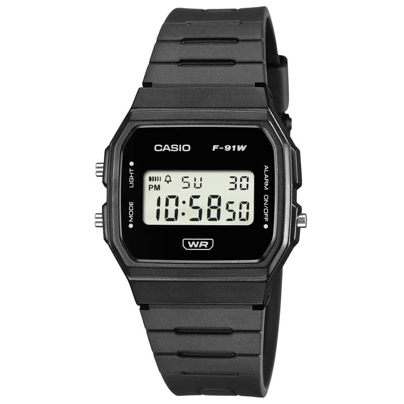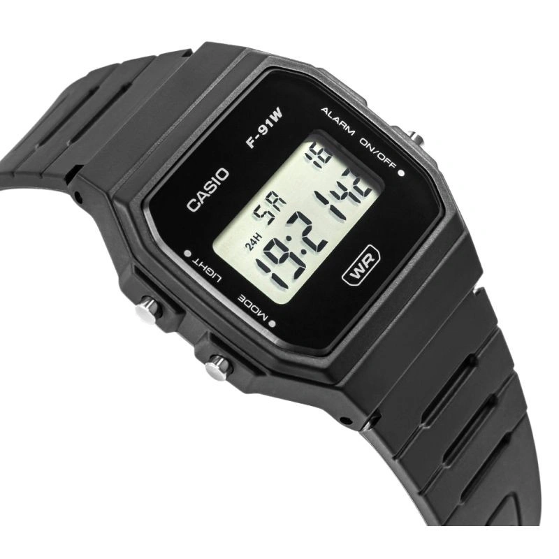 Hodinky Casio F-91WB-1ADF nabízejí sadu klasických praktických funkcí, které z tohoto modelu učinily ikonu jednoduchosti a spolehlivosti: přesné digitální hodinky s 24hodinovým formátem, stopky s mezičasem 1/100 sekundy, denní budík s funkcí signalizace celé hodiny, automatický kalendář zohledňující dny v měsíci, podsvícení LED (Micro Light) pro čtení ve tmě, výdrž baterie až 7 let, voděodolnost chránící před stříkající vodou, režim 12/24 h, kompaktní a lehká plastová konstrukce pro pohodlné nošení a klasický retro design s přehledným LCD displejem a výrazným obdélníkovým tvarem obálky, takže hodinky F-91WB-1ADF v sobě spojují funkčnost, odolnost a nadčasový styl v jedněch ikonických hodinkách Casio.