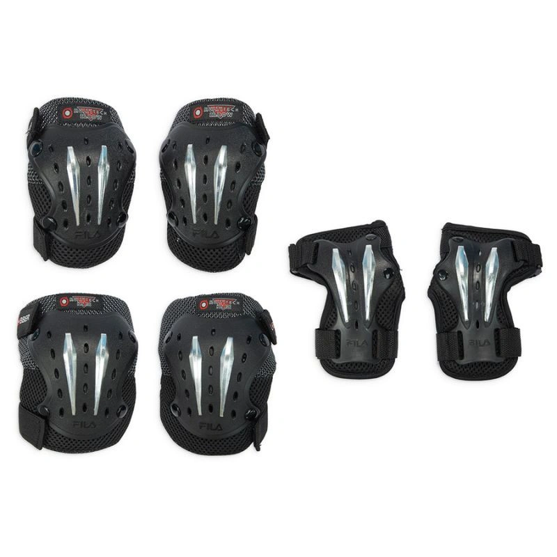 - Chrániče FILA obsahují: chrániče kolen, chrániče loktů a chrániče zápěstí.
