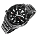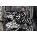 Černé pouzdro z ušlechtilé oceli se vyznačuje výraznou ozubenou lunetou, jejíž design je inspirován japonskou rybou "Fugu" - symbolem síly a přesnosti. jednosměrná, otočná luneta umožňuje bezpečné měření času při ponoru, což z ní činí nepostradatelnou pomůcku při potápění. minimalistický, ale funkční ciferník byl navržen pro maximální čitelnost i v obtížných podmínkách. den a datum, umístěné na 3. hodině, dodávají funkčnost, aniž by narušovaly ucelený, harmonický design. celek doplňuje červená hrotová šipka vteřinové ručičky, která podtrhuje dynamický a sportovní charakter tohoto modelu.