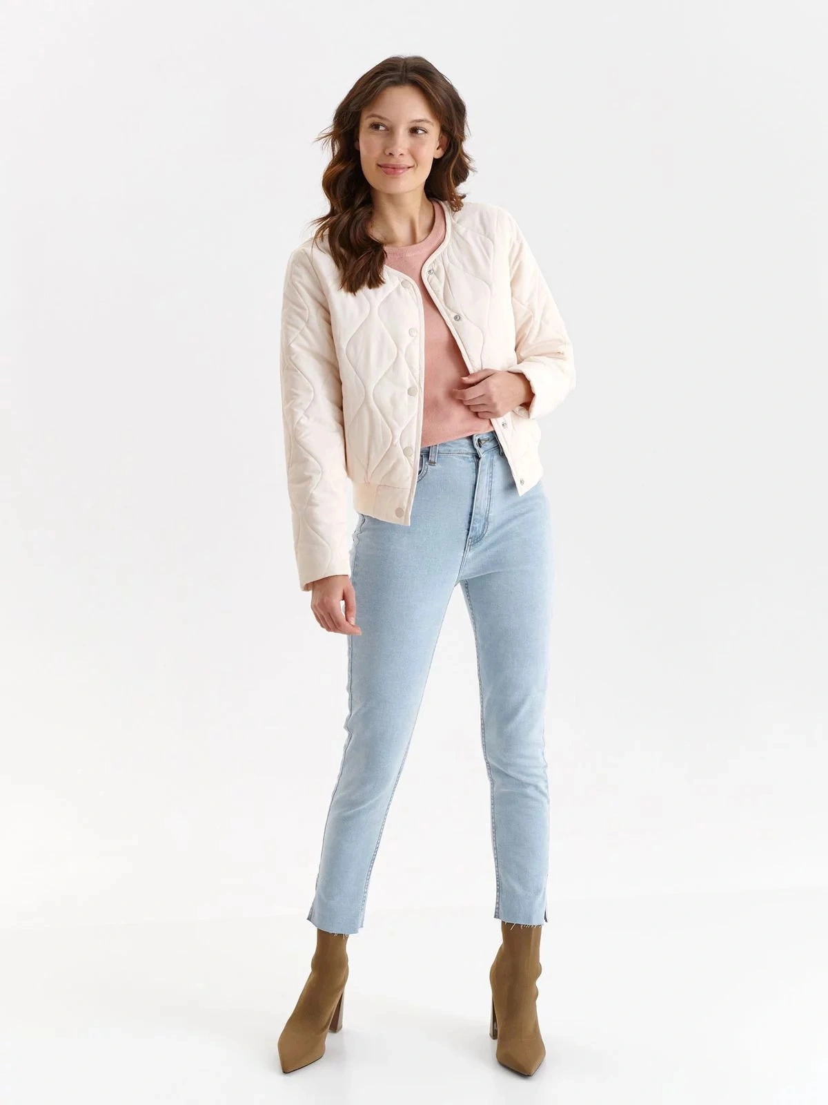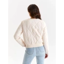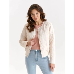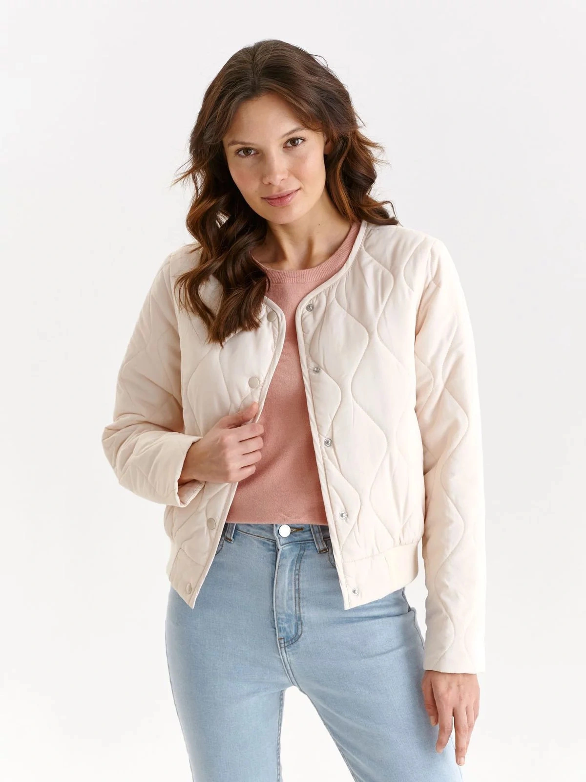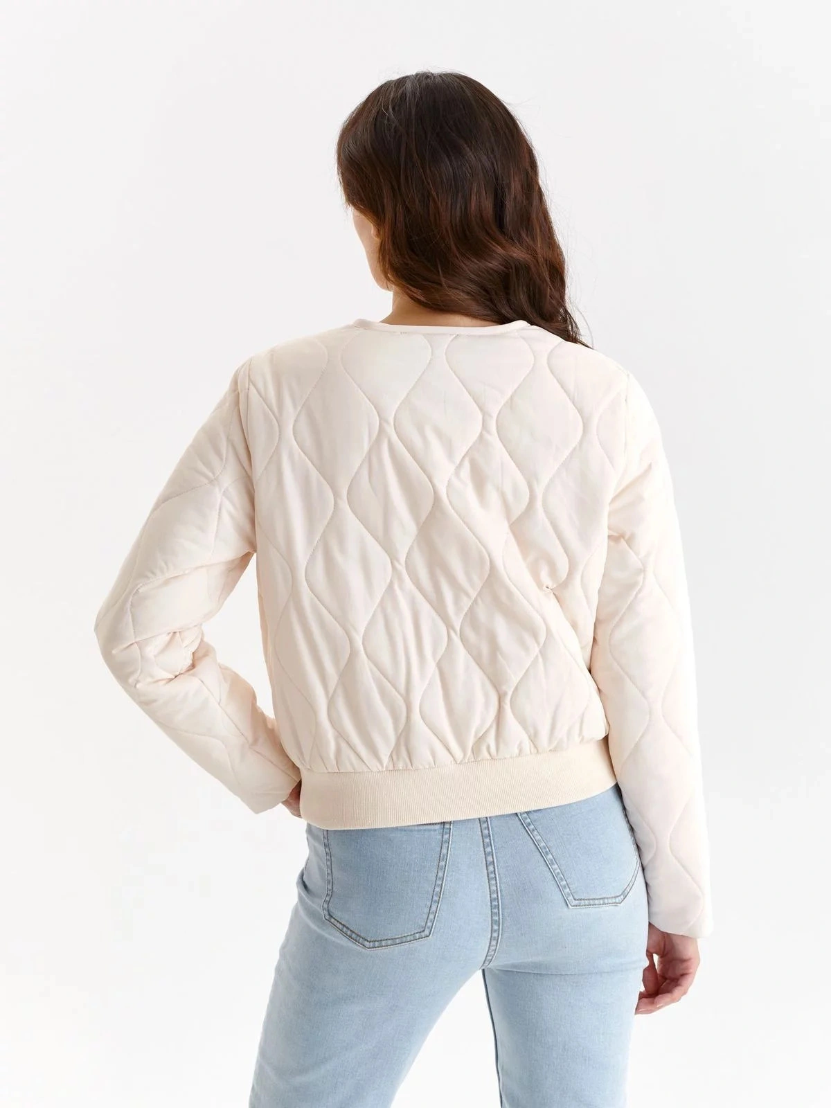 Tato krátká dámská bunda bomber je neuvěřitelně praktická a pohodlná při používání, má rovné dlouhé rukávy. Má široký stahovací lem, zapíná se vpředu na patentky a zdobí ho nápadité prošívání v podobě symetrických vírů. Má praktické kapsy na bocích a je vyrobena z úpletu velmi příjemného na dotek, který dokonale doplní prakticky každou dámskou ležérní stylizaci během chladnějších dnů a nocí.