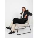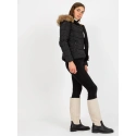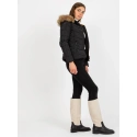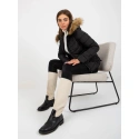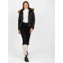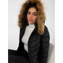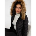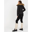 Černá prošívaná přechodová bunda s kožešinou na kapuci .