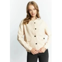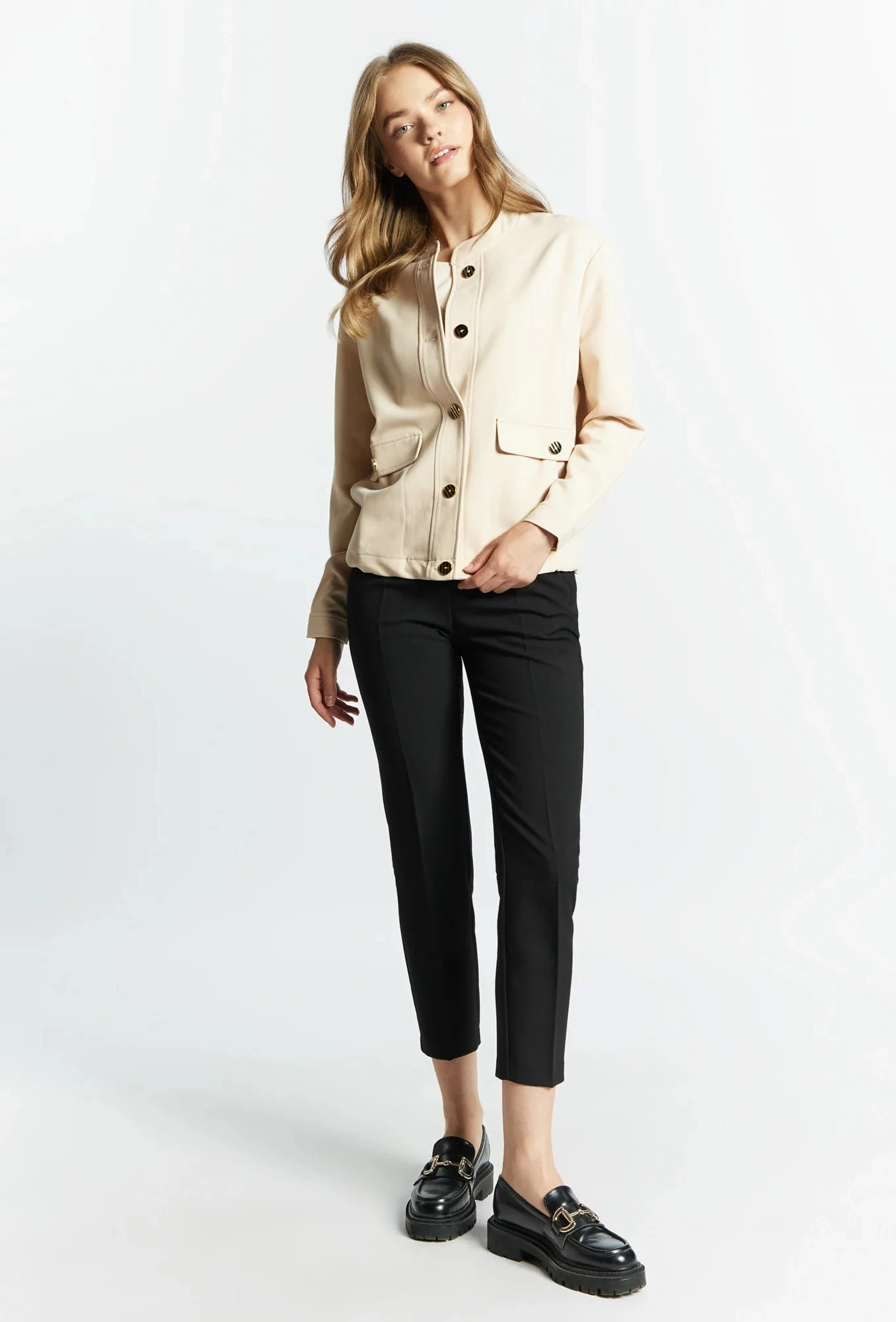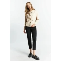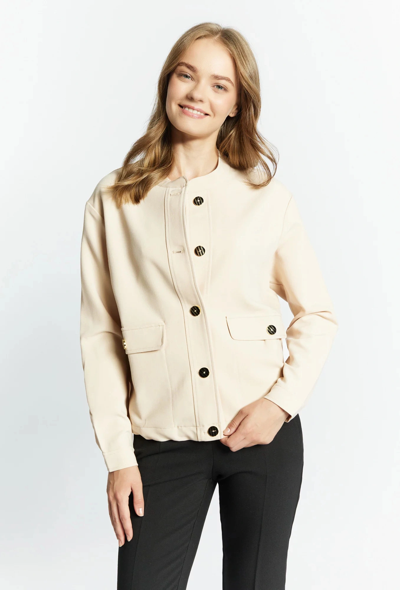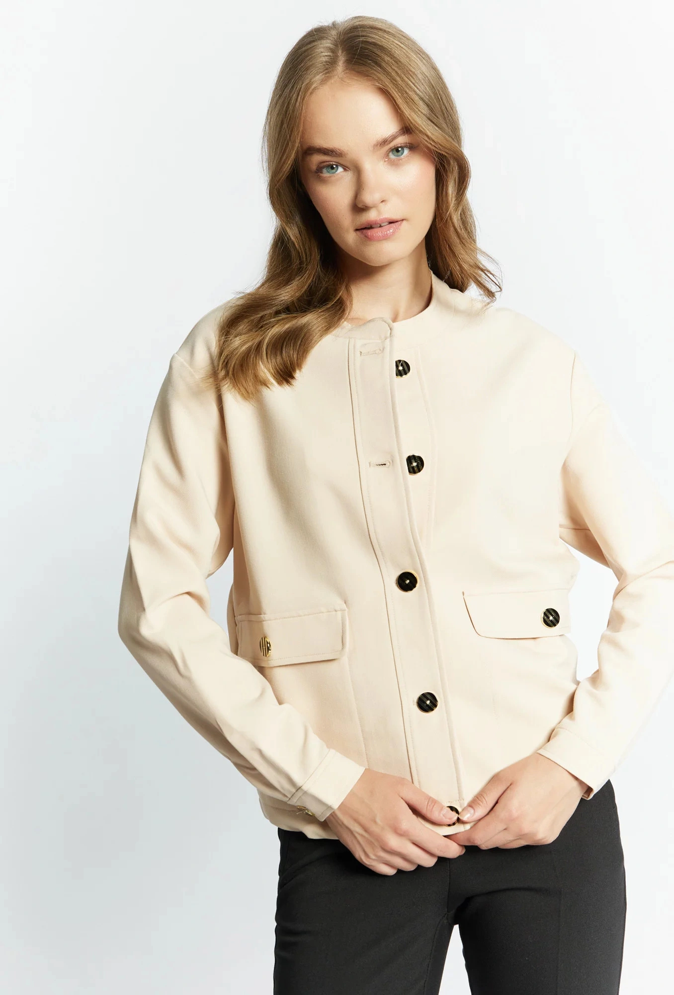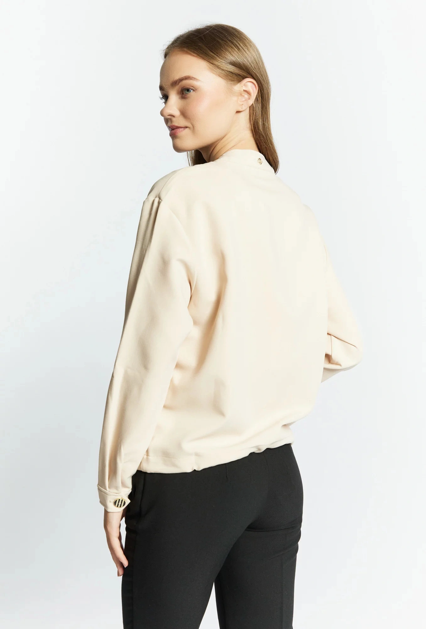 Elegantní dámská mikina s přídavkem viskózy. Mikina s půlkruhovým výstřihem, dlouhými rukávy a zapínáním na knoflíky. Mikina s klopami, zapuštěnými kapsami na bocích a lemem ve spodní části. Tento model je ideální pro každodenní použití i pro zvláštní příležitosti. Modelka na obrázku je vysoká 177 cm a má velikost 36.