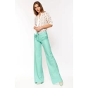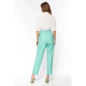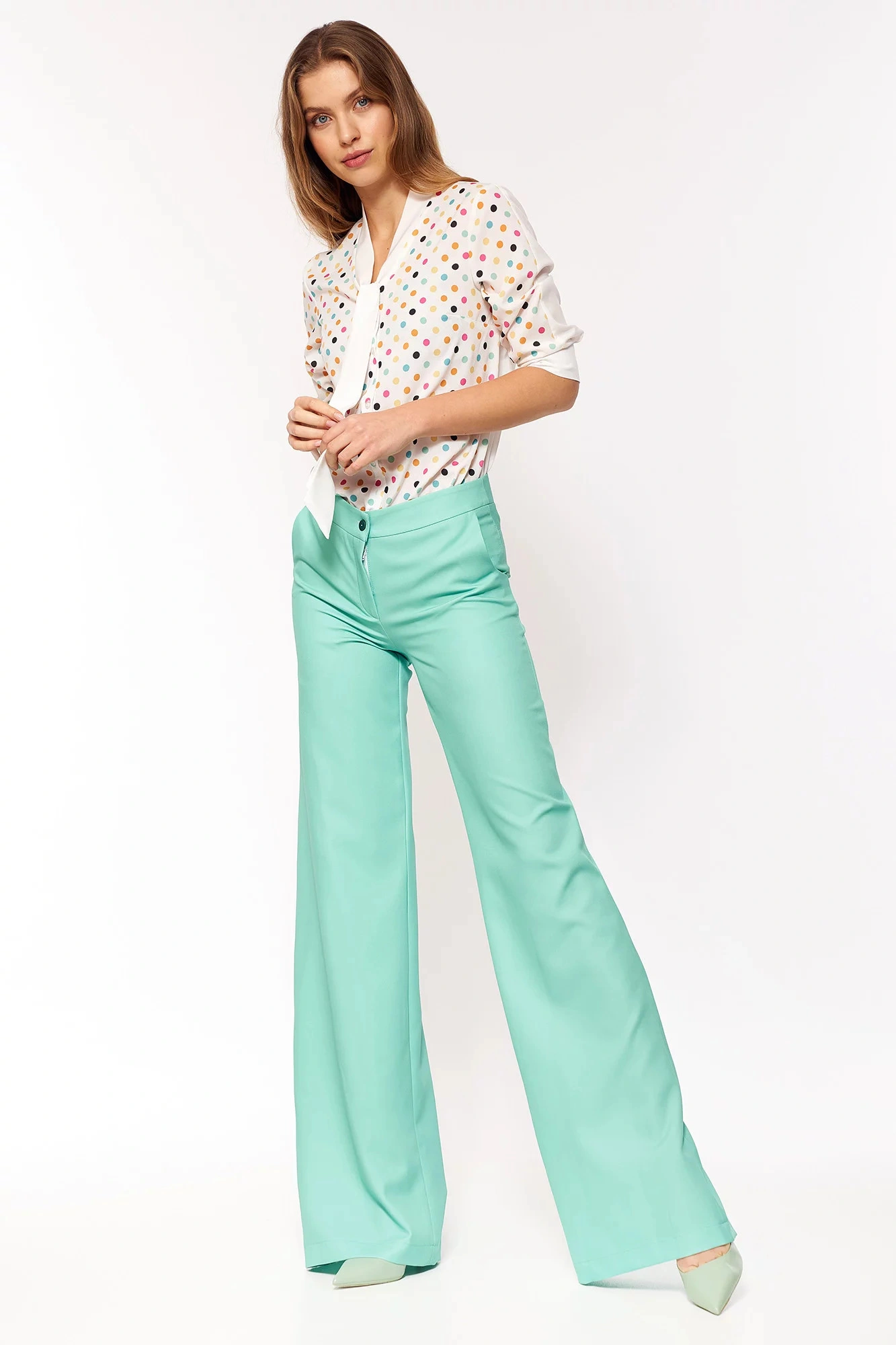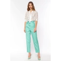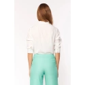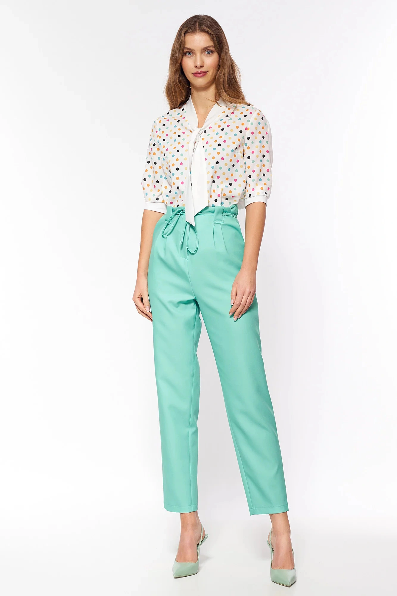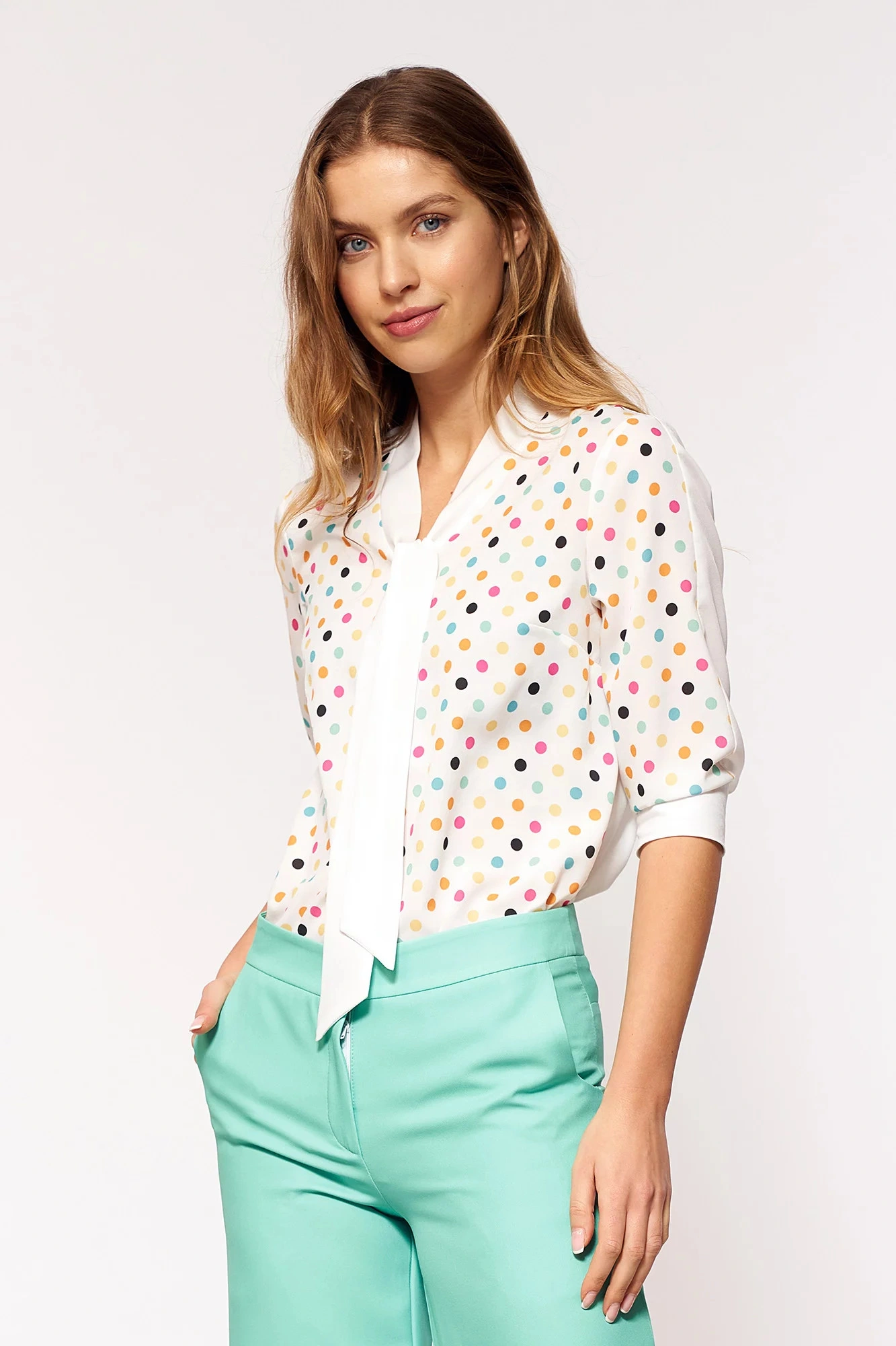Přiléhavá halenka se zapínáním vpředu a výstřihem ve tvaru V, zapínání na knoflíky. Rukávy pod loktem s manžetami na knoflíky. Neprůsvitný materiál.