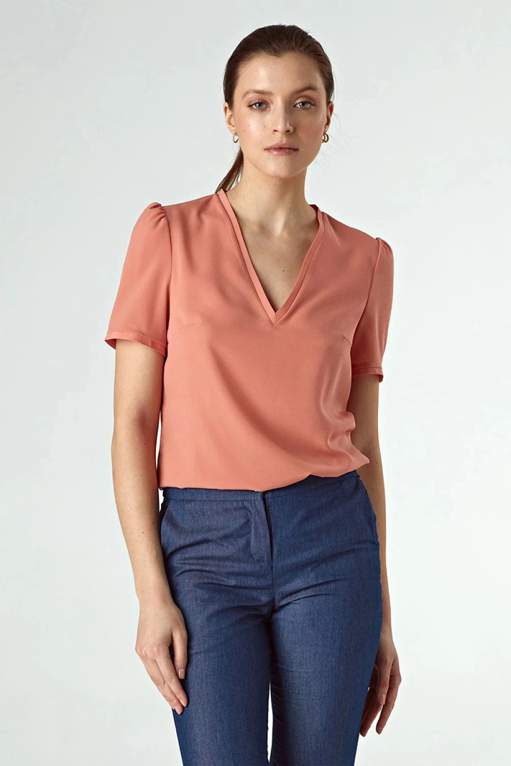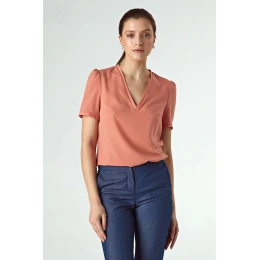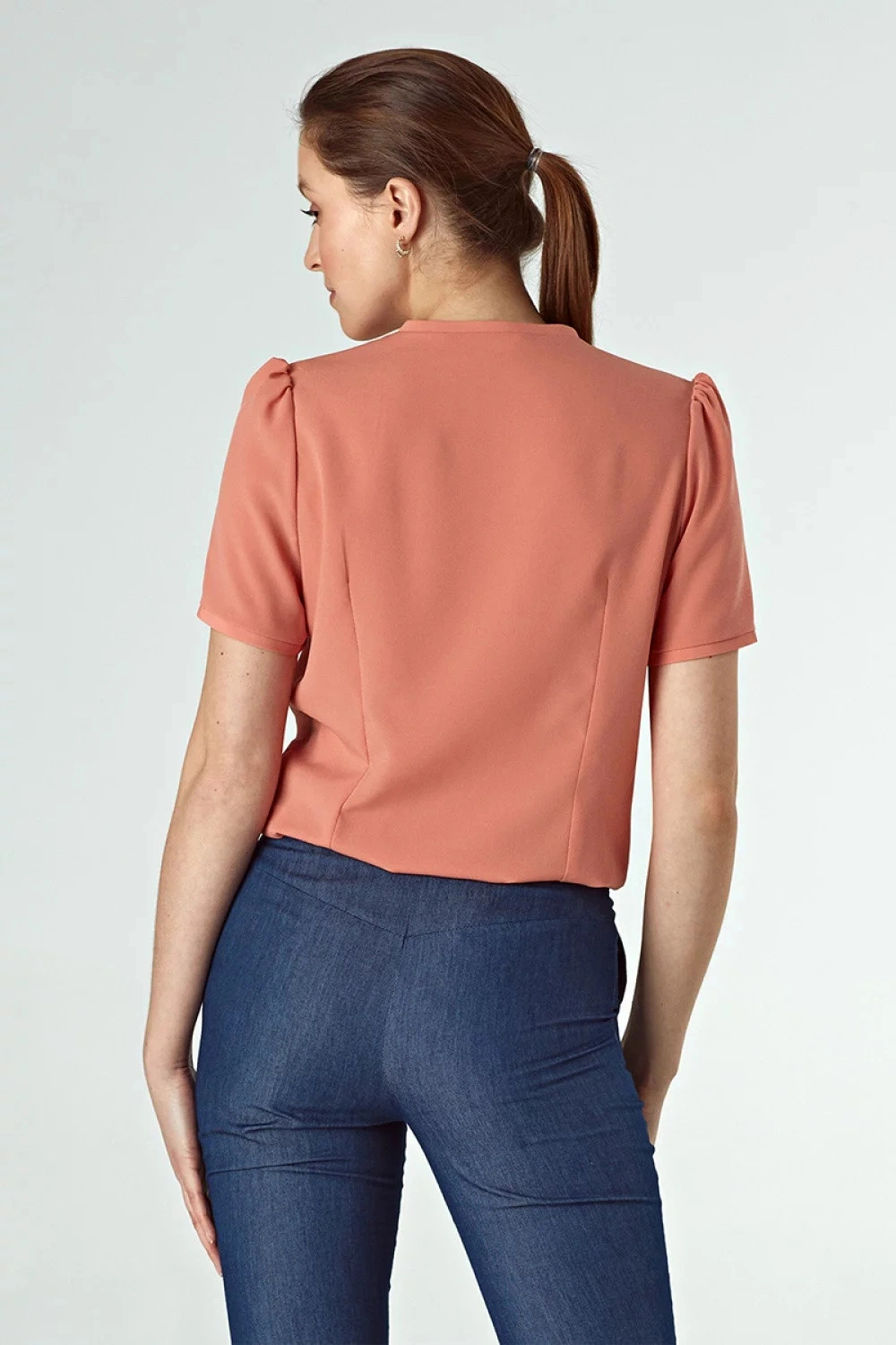 Jednoduchá košile s fontánou, kterou lze uvázat na mašli nebo nechat volně rozvázanou. Mírně vypasov