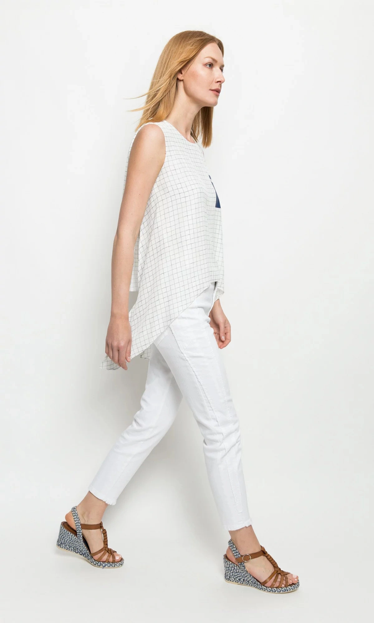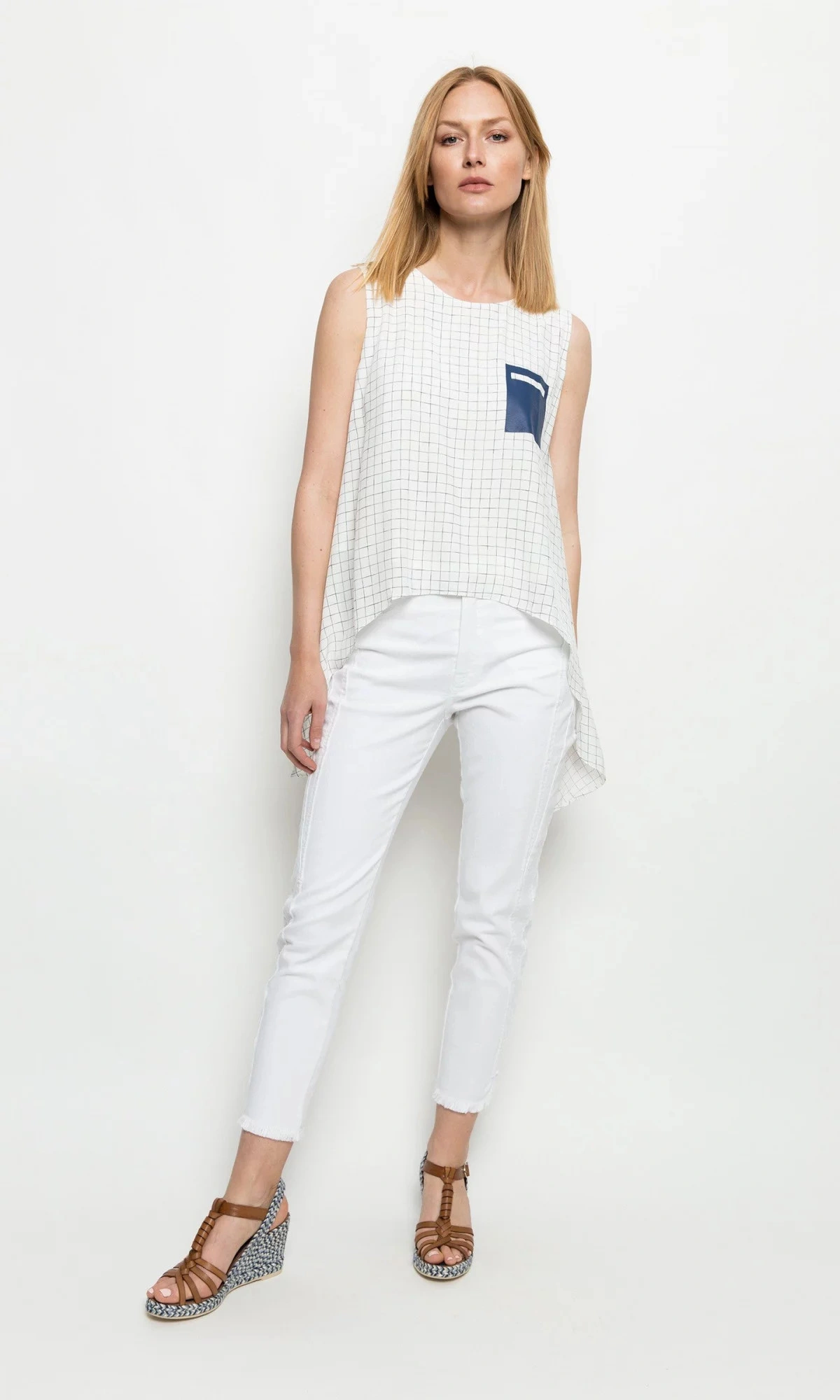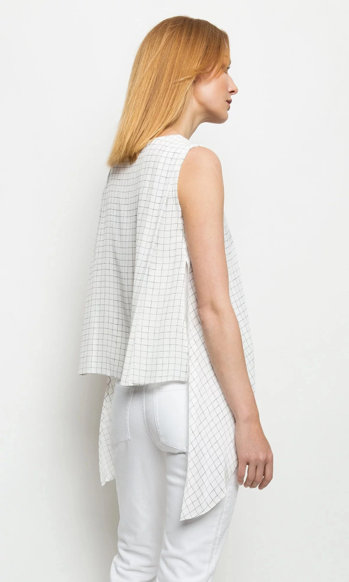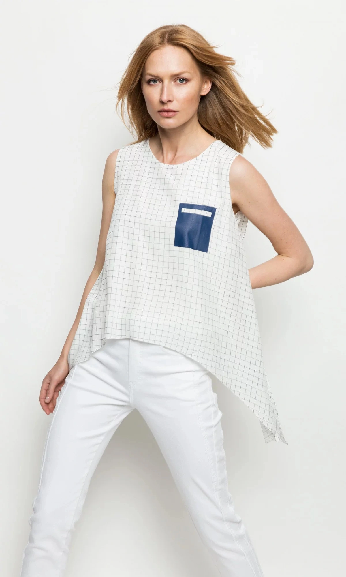 Bílá asymetrická kostkovaná halenka s tmavě modrým prvkem.59% viskóza 41% hedvábíPokyny pro péči: pokyny pro praní: profesionální chemické čištěníPohlaví: ženské