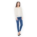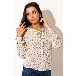 Velmi jemná a tenká halenka K135 KATRUS je k objednání ve třech barvách. Halenka s dlouhým rukávem a vázačkou u krku má potisk ptáčků a pírek.