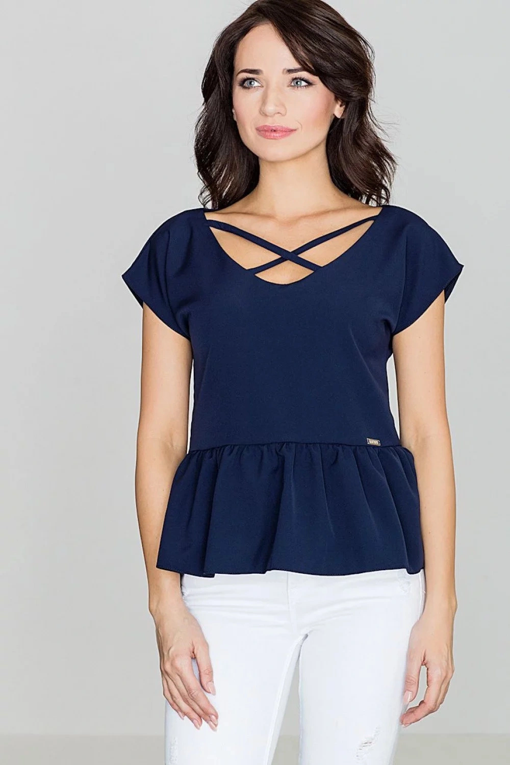 Dámská halenka z příjemné na dotek, mírně elastické směsi látek. Rovný střih s rukávy decentně spadajícími na ramena. Model s širokým výstřihem do V spojeným zkříženými pruhy látky. Spodní část je zakončena asymetrickým volánem, díky kterému se pěkně přizpůsobí bokům. Plaketa s názvem značky na boku.