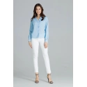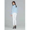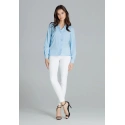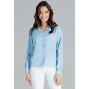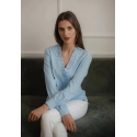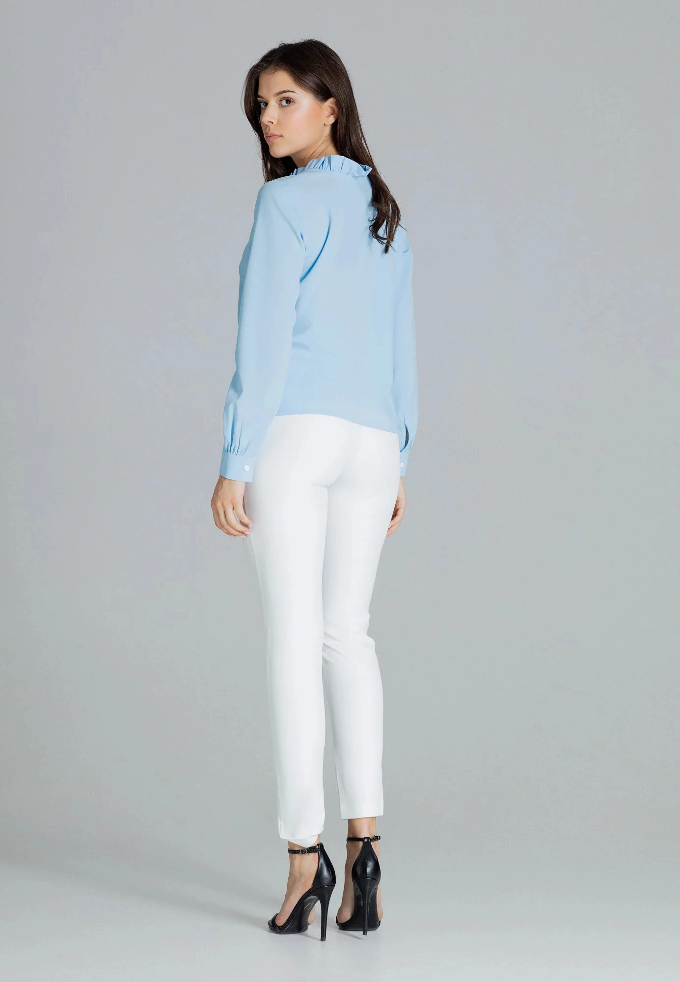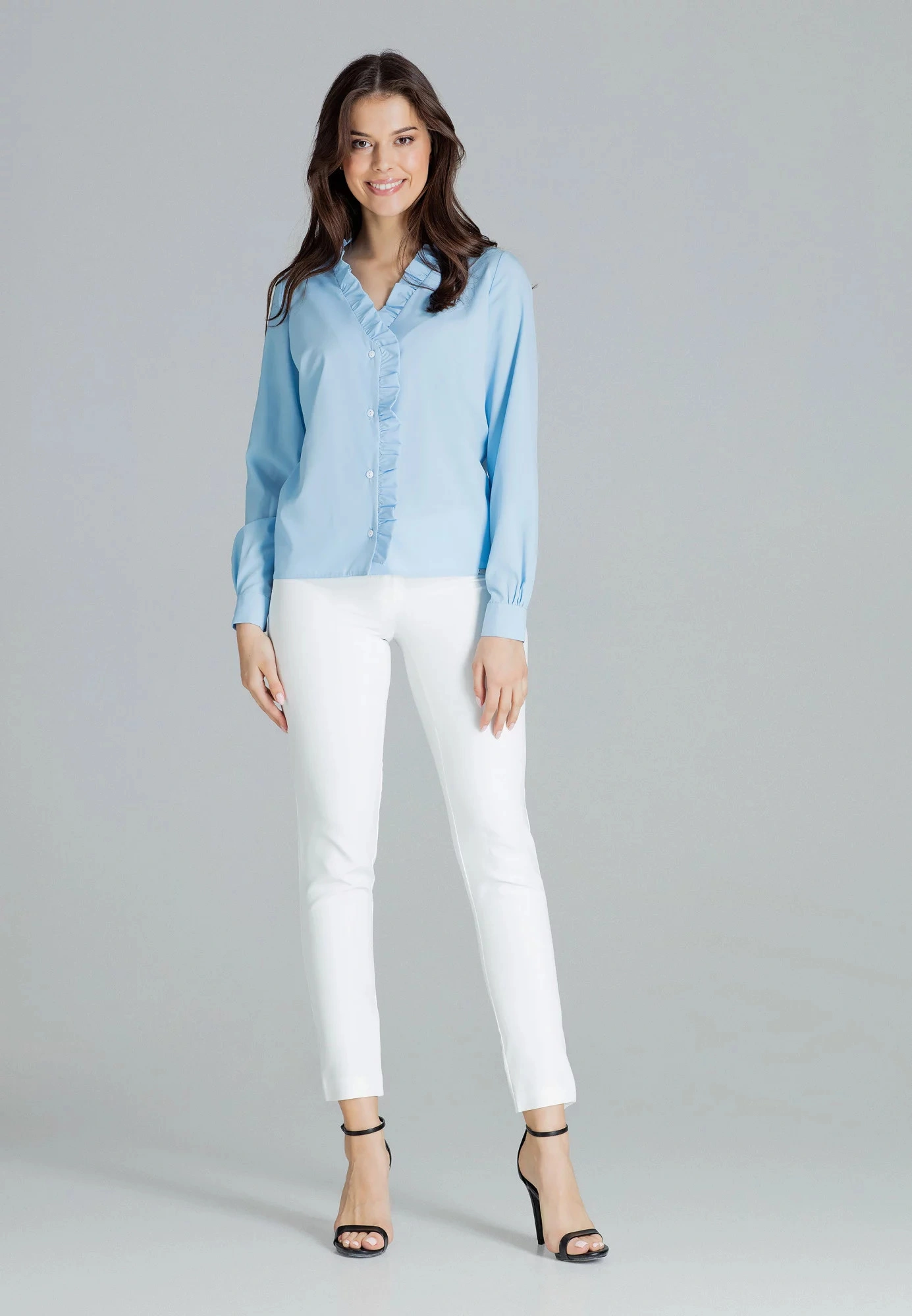Klasická jednoduchá halenka s véčkovým výstřihem a volánem po celé délce. Dlouhý rukáv s nařasenou manžetou. Zapínání na knoflíky vpředu.
