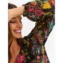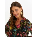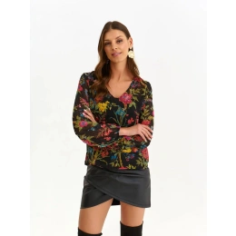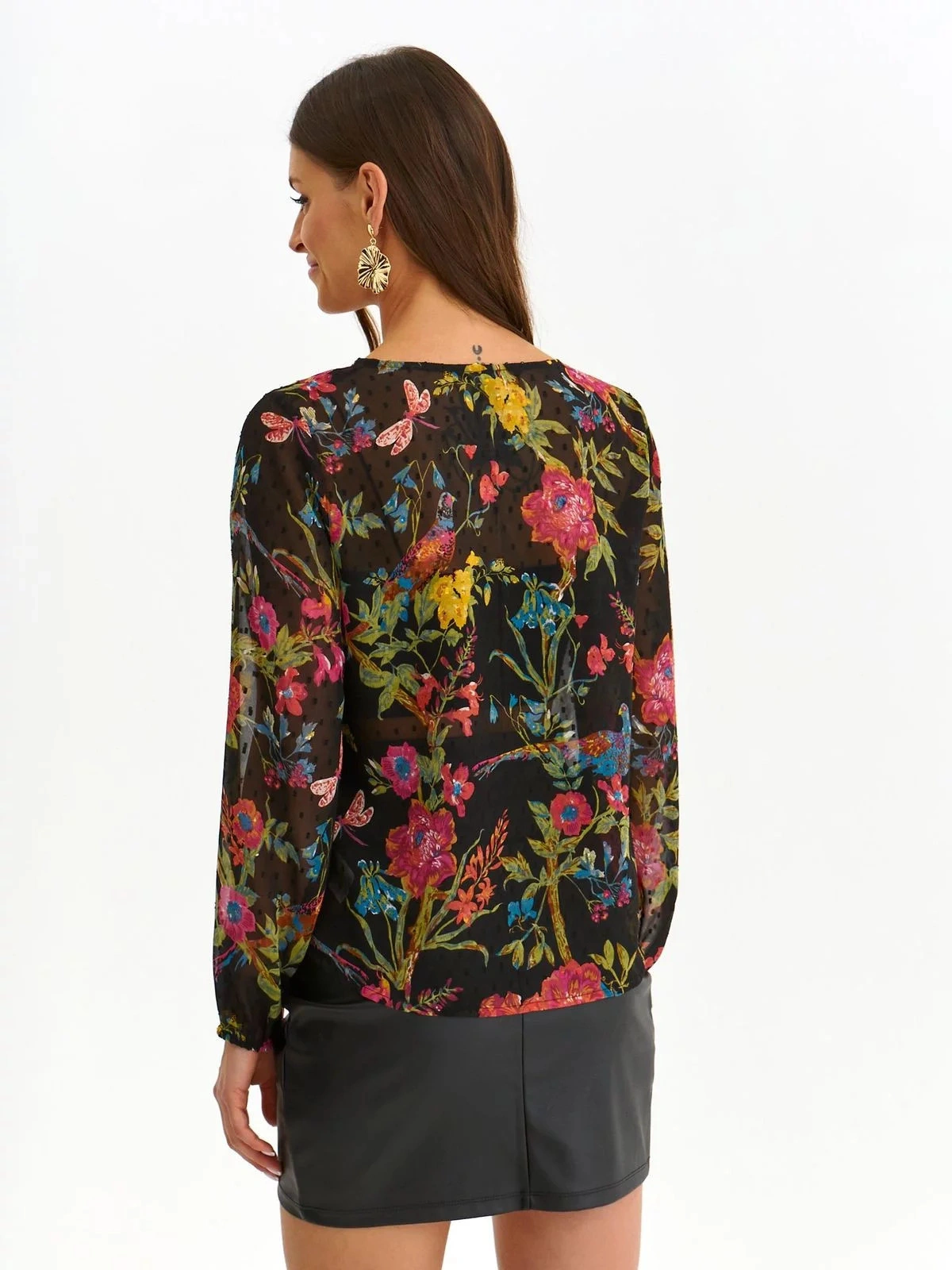 Dámská halenka s dlouhým rukávem, s výstřihem do V, průhledná černá s potiskem květů a vážek.