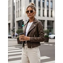 Tato dámská bunda ramon s padnoucím střihem a klasickými klopami se dobře hodí pro každodenní stylizaci i mimopracovní outfity. Zapínání na zip usnadňuje rychlé oblékání a umožňuje upravit polohování předního dílu. Dvě boční kapsy na zip uspořádají drobné předměty a udrží je v bezpečí a bunda je vyrobena z ekologické kůže.