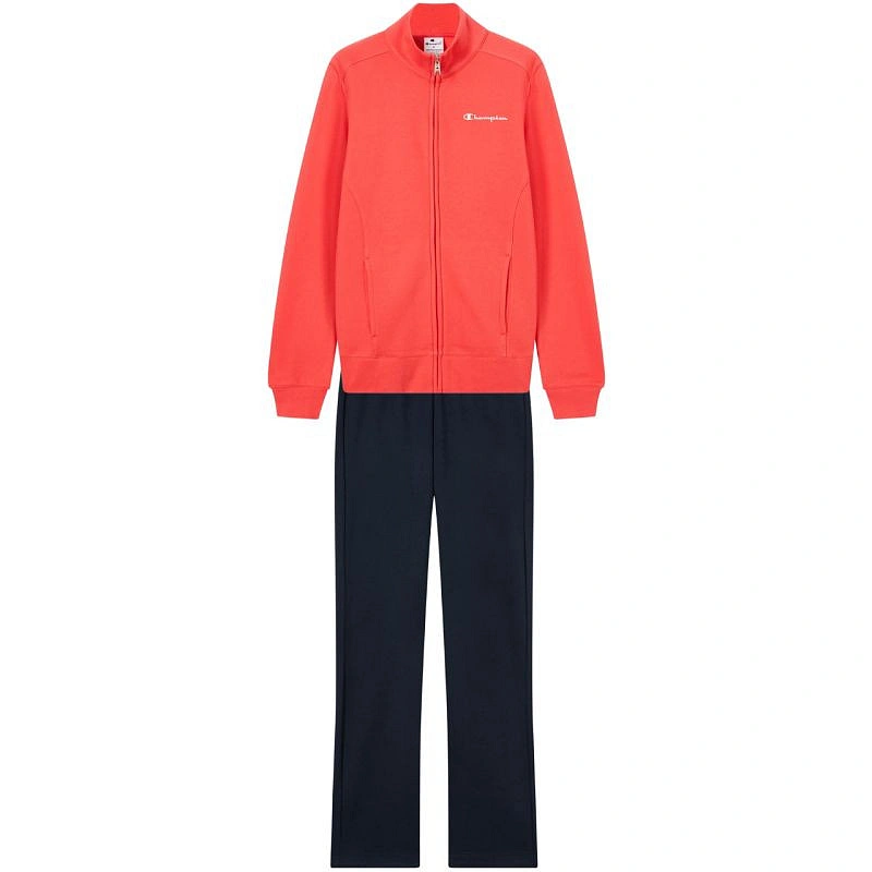Dámská tepláková souprava Champion s celorozepínacím zipem oranžová/modrá 118289 RS073 Dámská tepláková souprava Champion je tepláková souprava pro každodenní nošení. Měkký materiál na dotek s vysokým podílem bavlny. Přidaná polyesterová vlákna. Standardní střih. Blůza s jednosměrným zipem. Žebrované manžety a spodní lem. Otevřené kapsy na blůze. Kalhoty s nohavicemi zakončenými malými rozparky a nastavitelnou elastickou šňůrkou v pase. Kalhoty bez kapes. Materiál: 55 % bavlna, 45 % polyester.