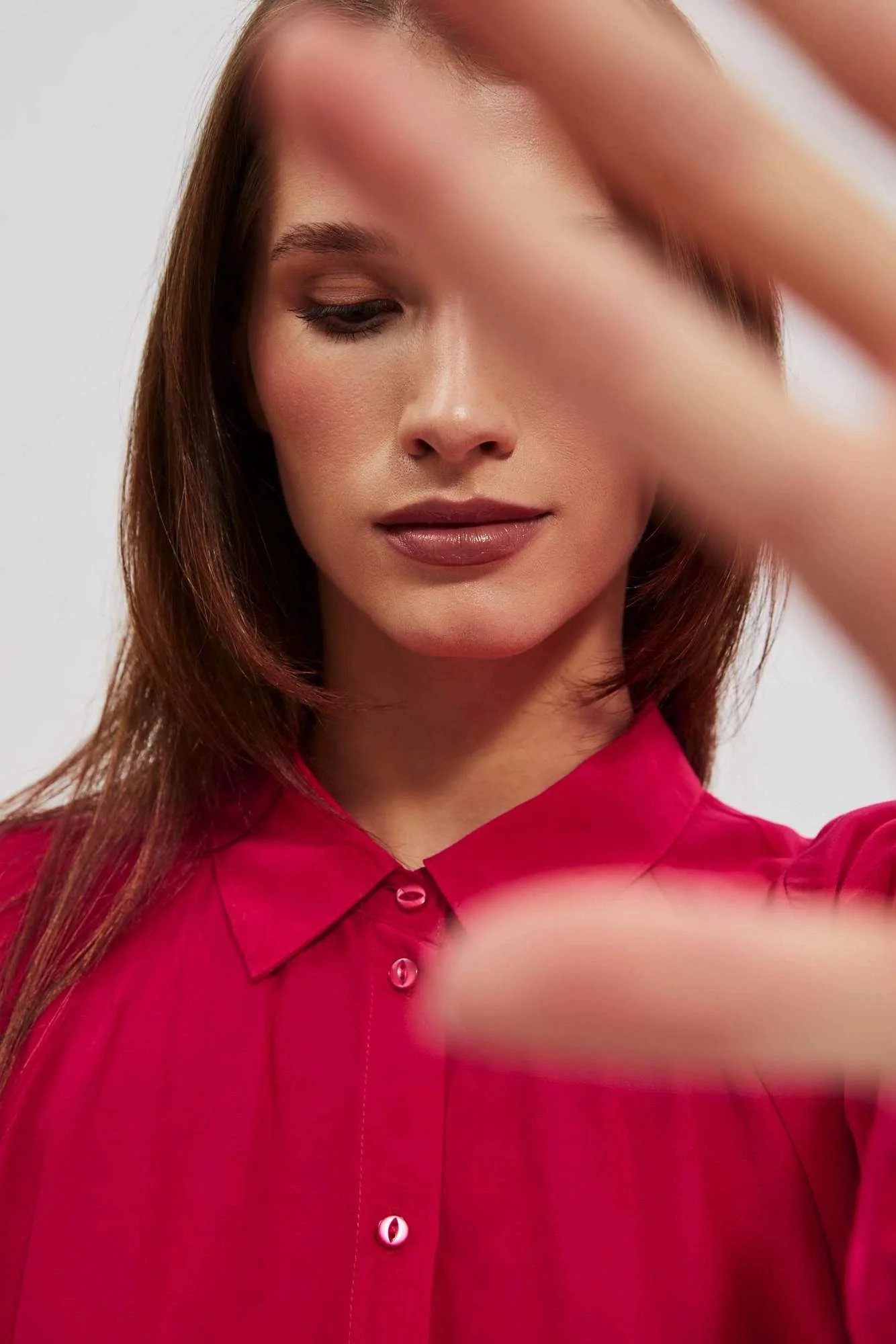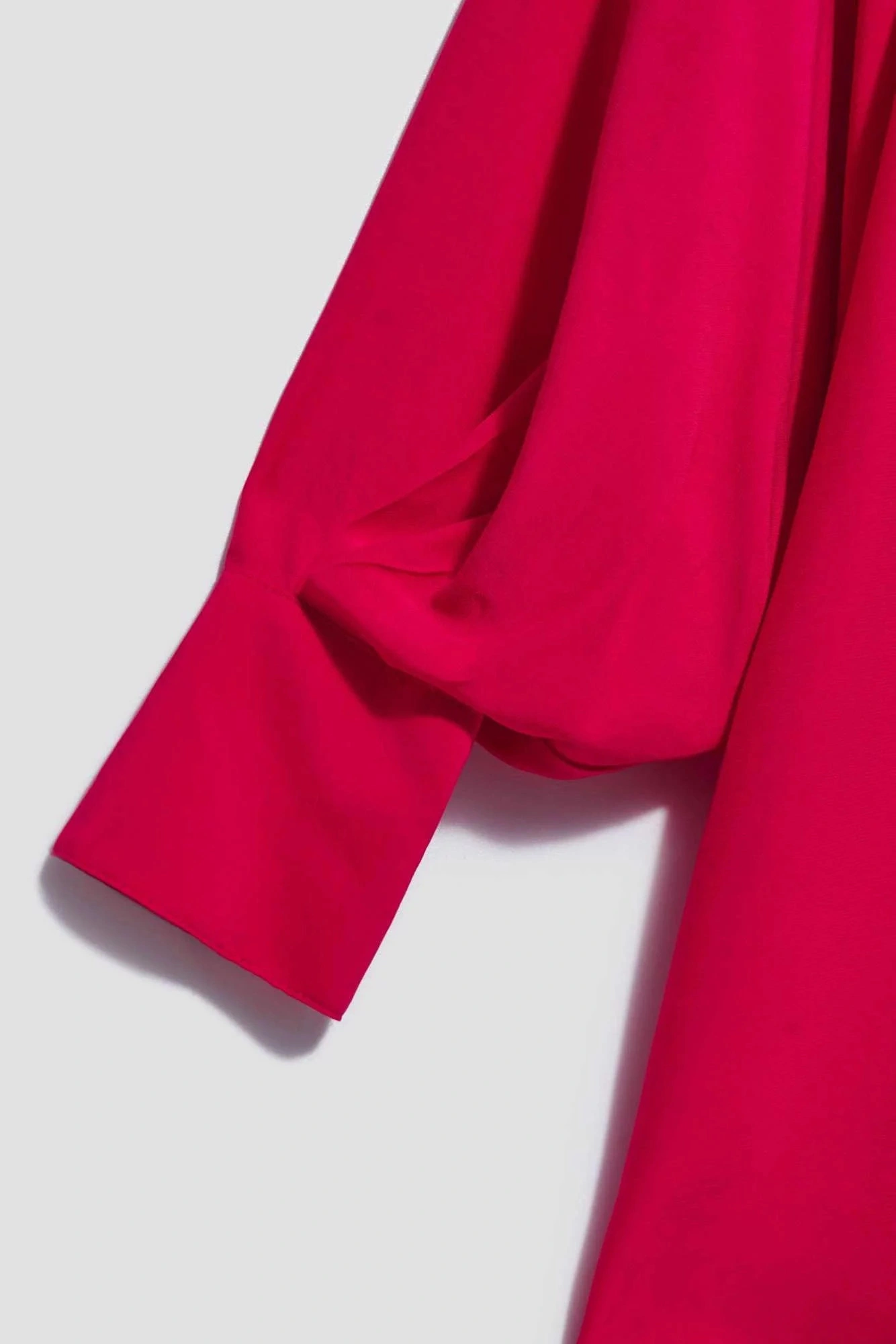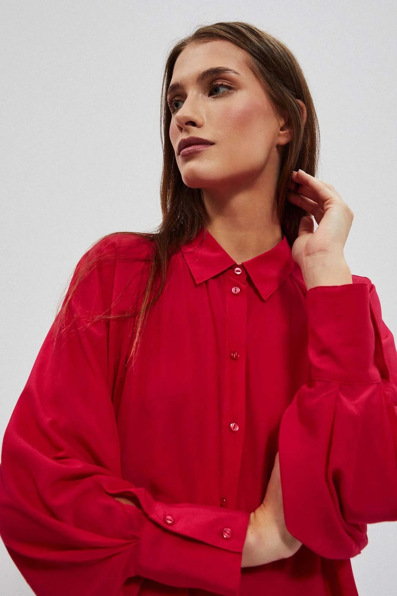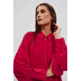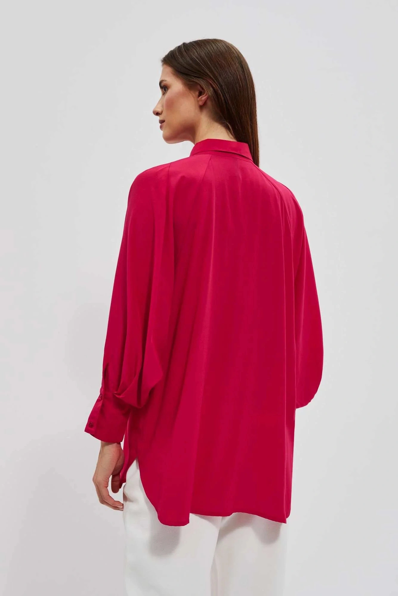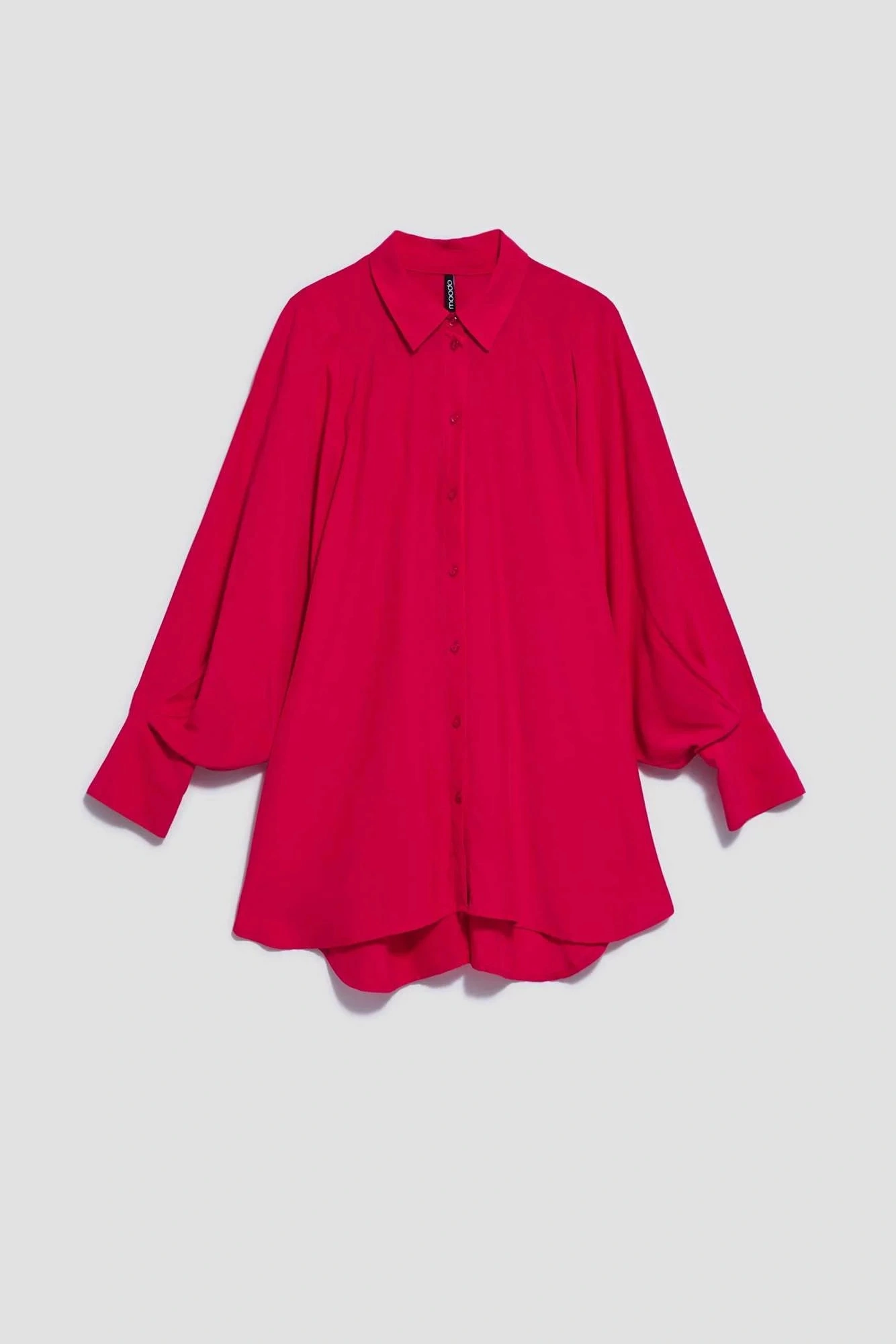 80% POLYESTER, 17% BAVLNA, 3% ELASTAN Elegantní košile s dlouhými, širokými, nabíranými rukávy. Rukávy jsou zakončeny volány a širokými manžetami se zapínáním na dva malé knoflíky. Vyrobeno v tmavě růžové barvě. Klasický stahovací límec s knoflíkem. Ve spodní části mírně rozšířená splývavá látka tvoří krásný tvar A. Spodní díl tuniky mírně zaoblený. Hladký materiál, bez vzoru. Oversize střih a delší střih skvěle sluší každé postavě. Lehké a pohodlné na nošení.