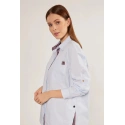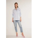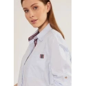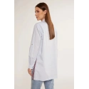 Bavlněné dámské tričko s ozdobnými vsadkami v podobě pruhů. Košile s dlouhými ohrnutými rukávy a rozparky na bocích. Košile s prodlouženým zadním dílem, zapínaná na knoflíky s klasickým límcem. Na linii poprsí je našitá kapsa. Tento model je ideální pro každodenní použití i pro zvláštní příležitosti.