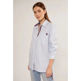 Bavlněné dámské tričko s ozdobnými vsadkami v podobě pruhů. Košile s dlouhými ohrnutými rukávy a rozparky na bocích. Košile s prodlouženým zadním dílem, zapínaná na knoflíky s klasickým límcem. Na linii poprsí je našitá kapsa. Tento model je ideální pro každodenní použití i pro zvláštní příležitosti.