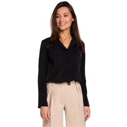 Tato halenka s knoflíky a dvojitými kapsami na hrudi má splývavou siluetu a lesklý lesk, který zvyšu