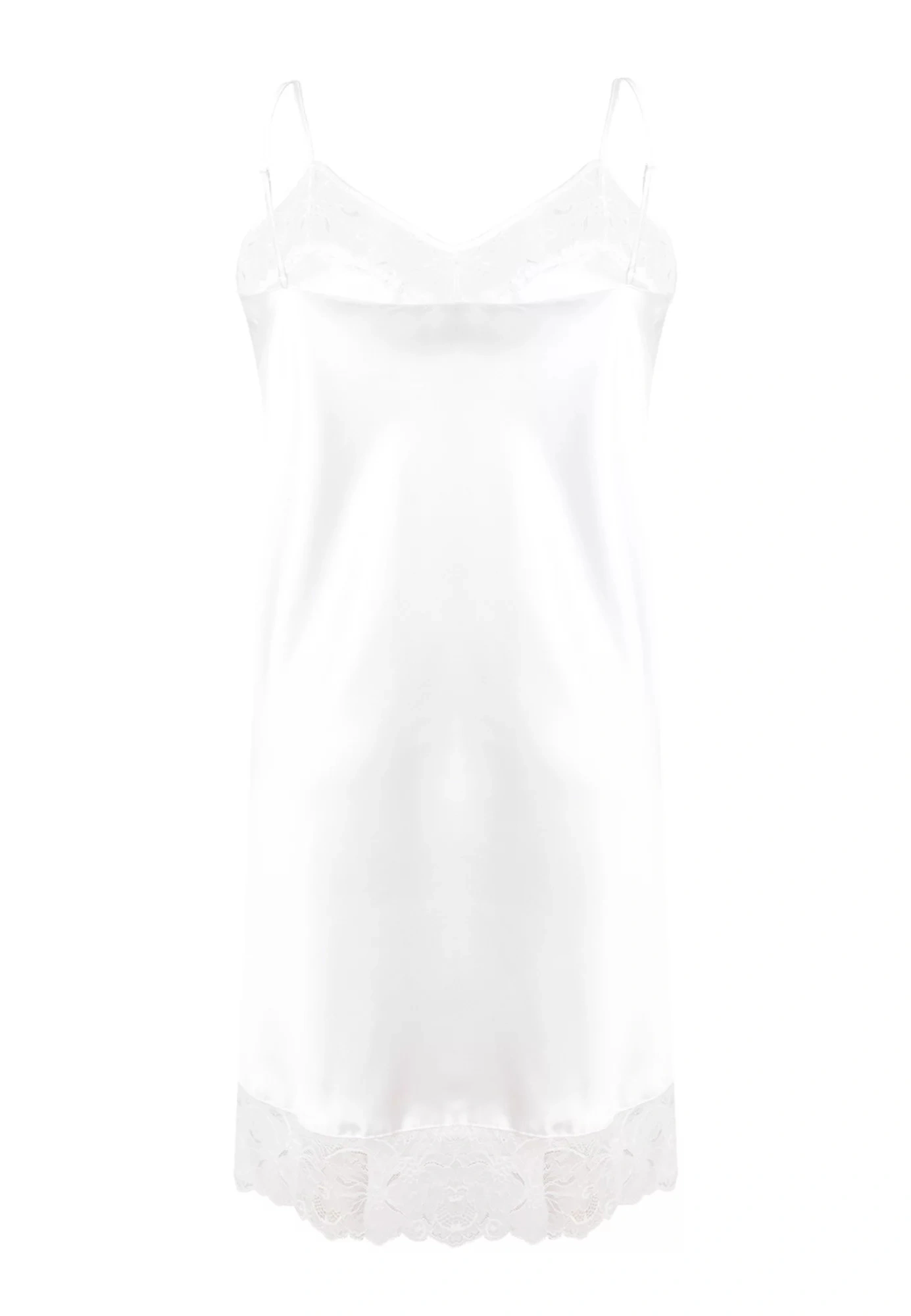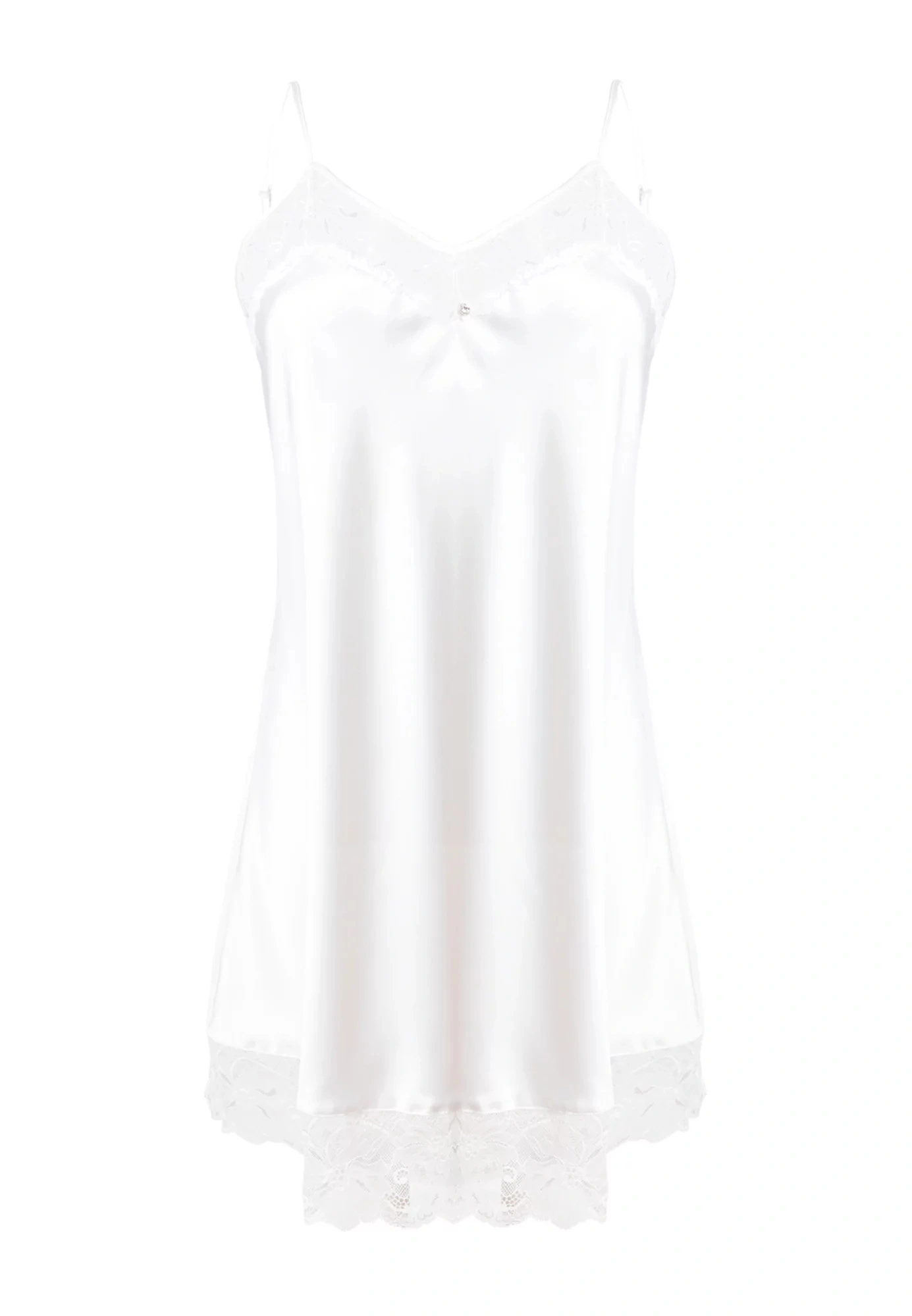Krajkový výstřih a spodní okraj košilky dodávají celému modelu na eleganci a stylu. Spojení košíčků je ozdobené lesklým zirkonem. Košilka má tenká ramínka, jejichž délku je možné nastavit. Lehce rozšířený střih směrem dolů je zárukou pohodlí a komfortu při nošení.