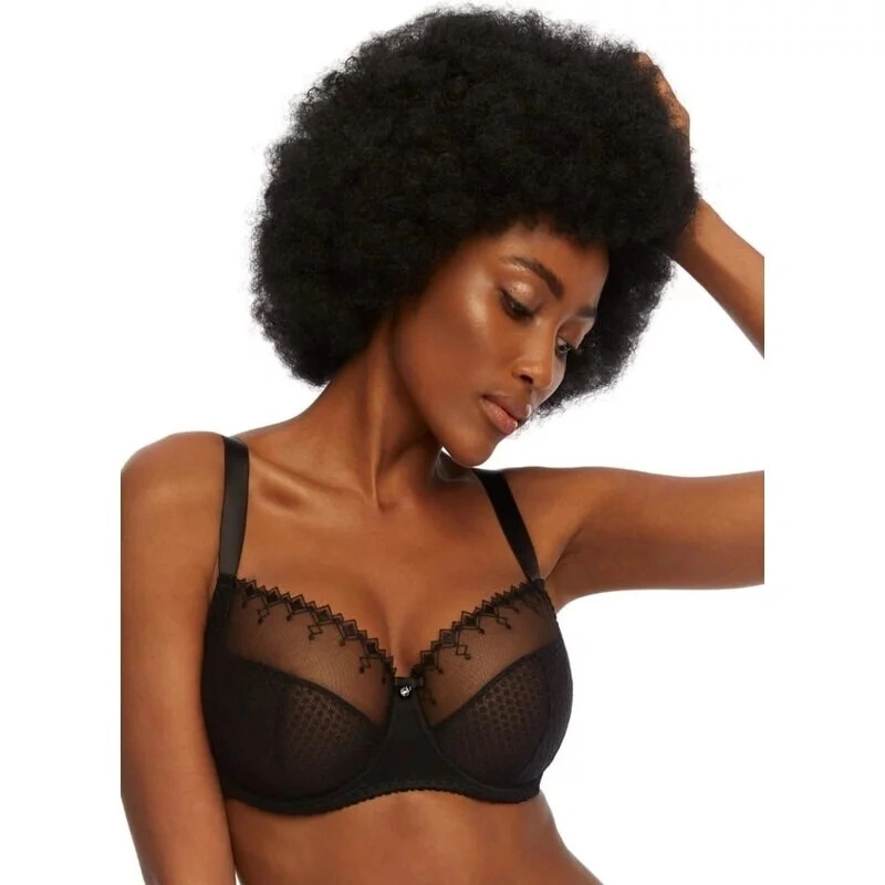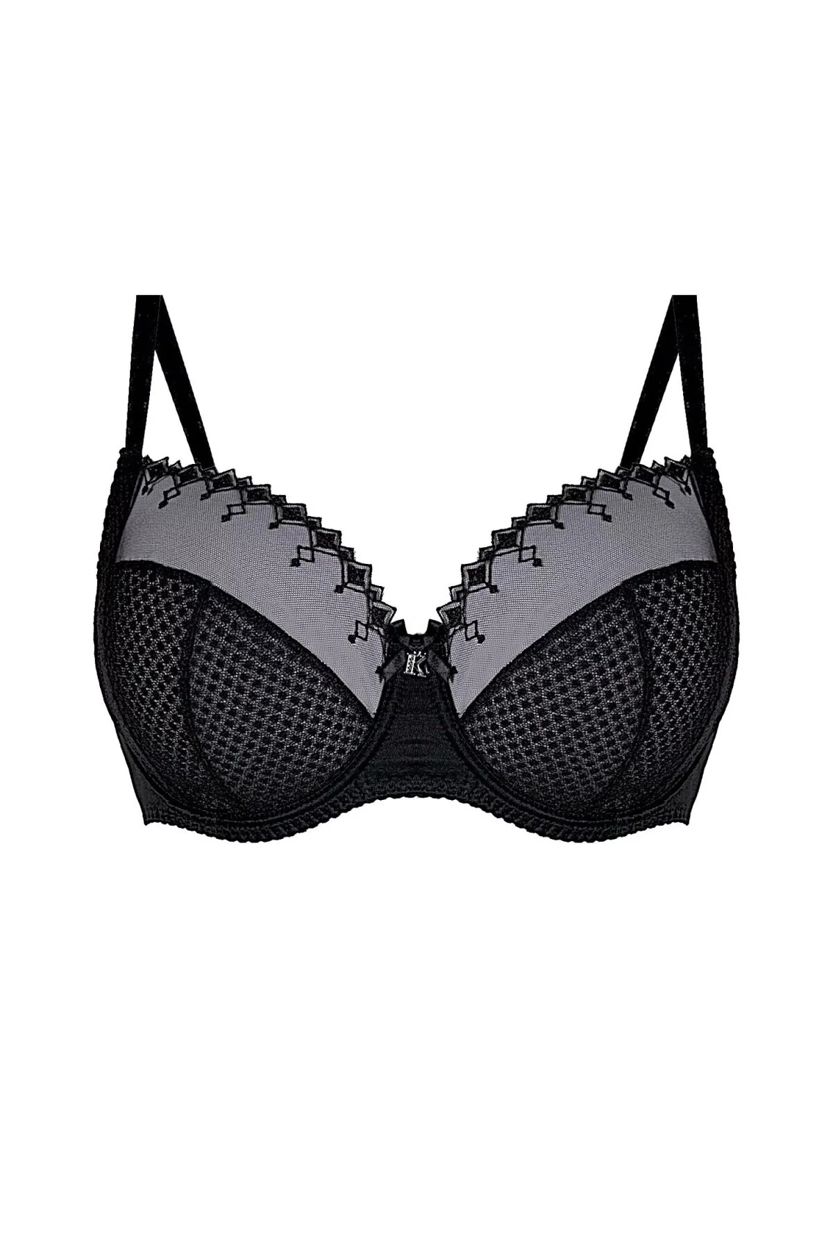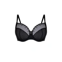 Košíčky podprsenky jsou vyrobené z jemné puntíkované krajky a jejich horní linii tvoří síťovina, která je ozdobená efektní výšivkou. Boky jsou zesílené svislými kosticemi. Ramínka tohoto modelu není možné odepnout.