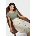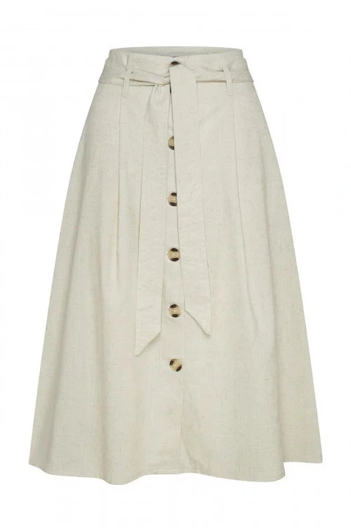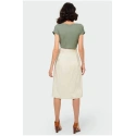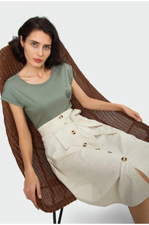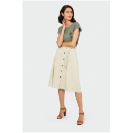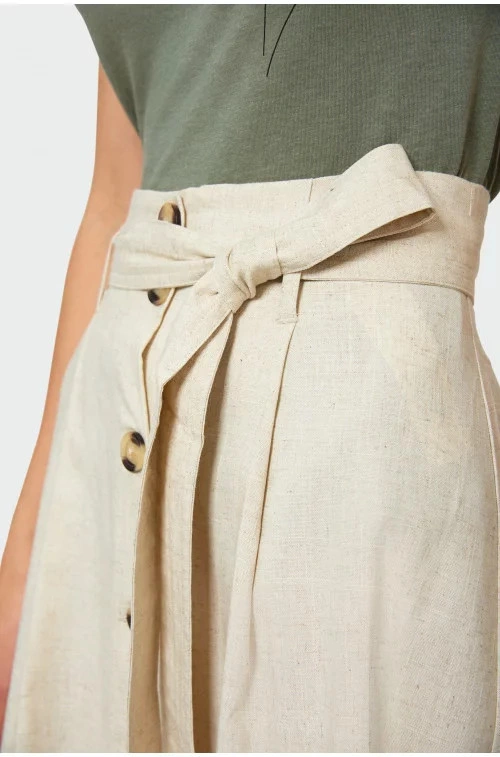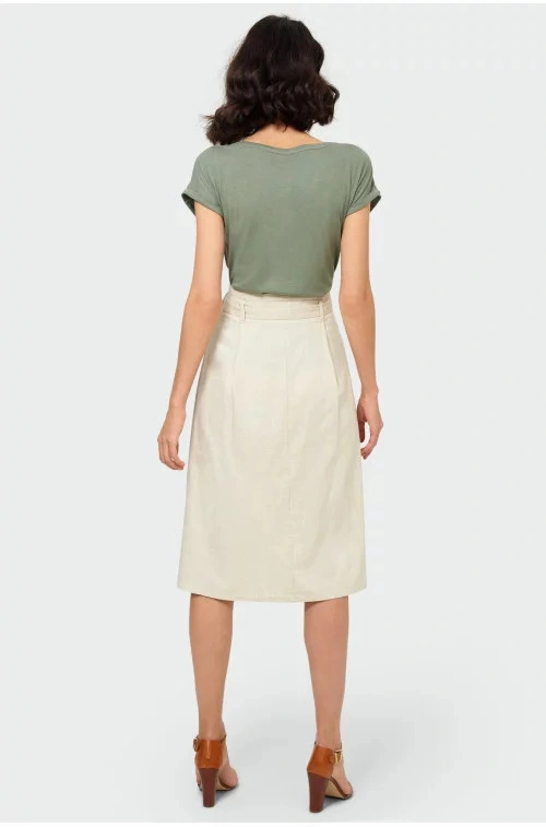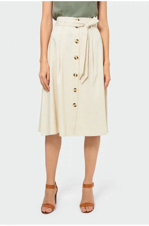 Elegantní sukně s vysokým pasem. Délka pod kolena. Zapínání na knoflíky po celé délce vpředu. Připojený pásek v pase, který zvýrazňuje postavu. Ležérní střih. Vyrobeno z tkaniny příjemné na dotek. Modelka na fotografii měří 179 cm a nosí velikost 36.