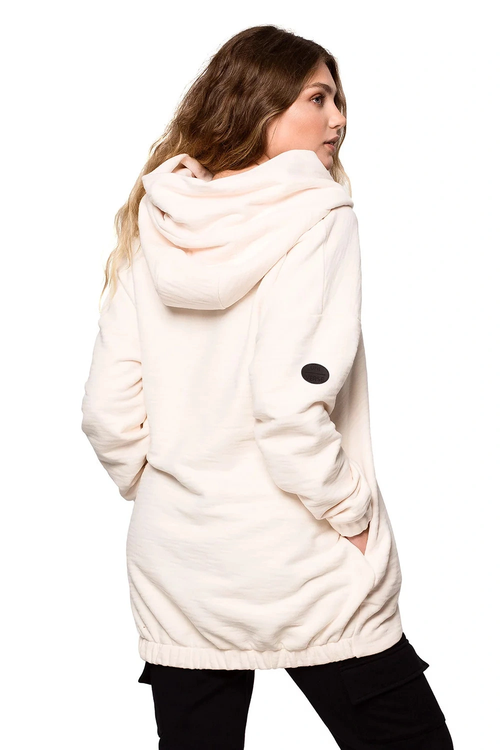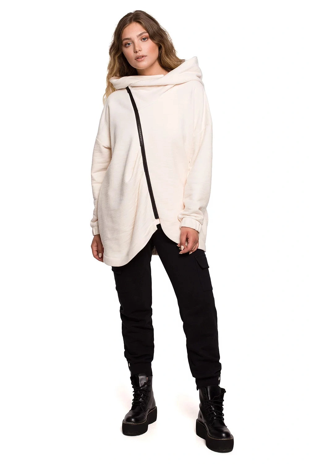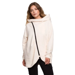 Hřejivá mikina s diagonálním zipem, příjemným límcem a prostornou kapucí. Střih připomíná tvar přesýpacích hodin - v pase je mírně zúžený a vzadu, ve spodní části, má všitou gumičku, která mikině dodává tvar.