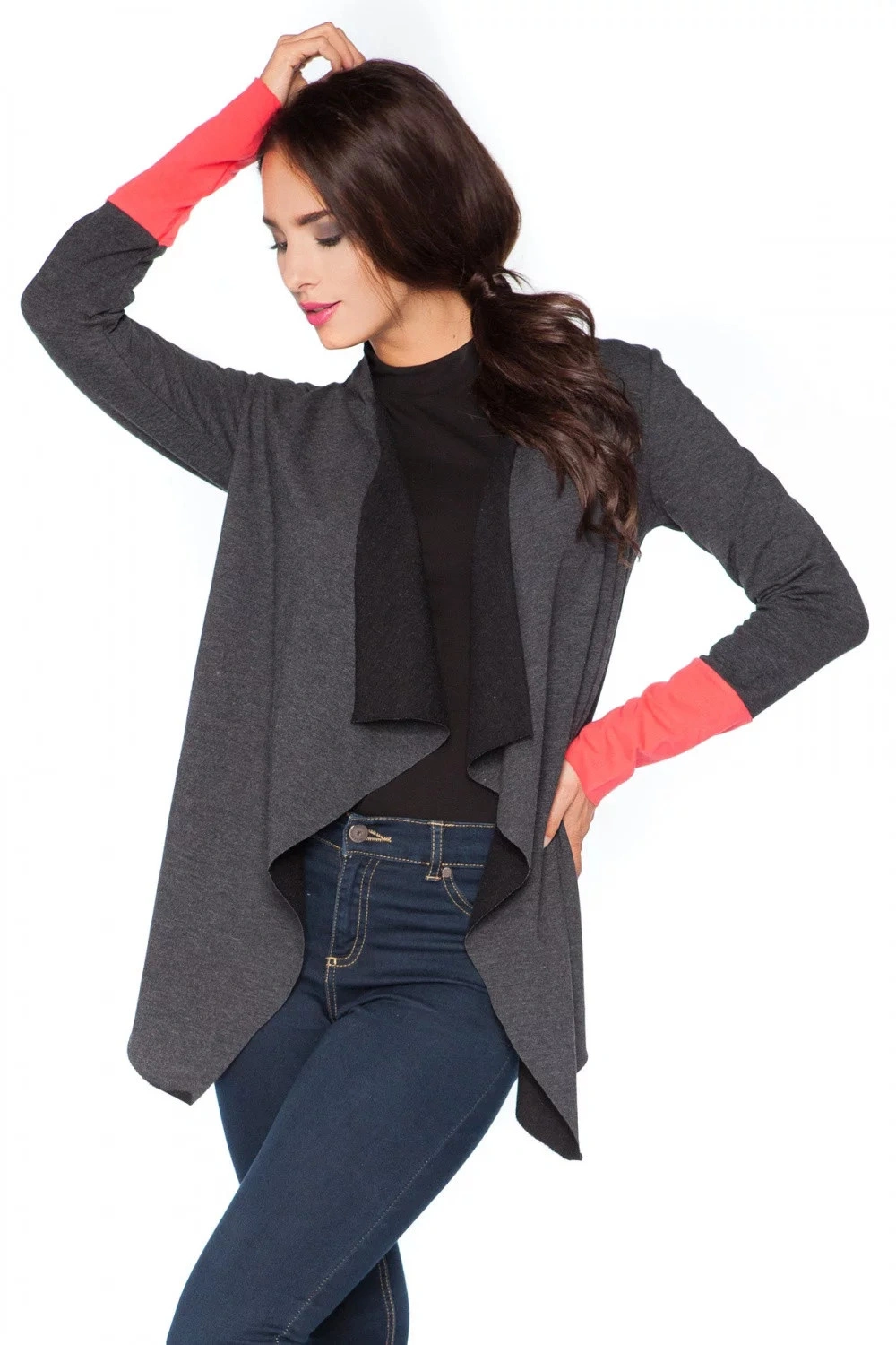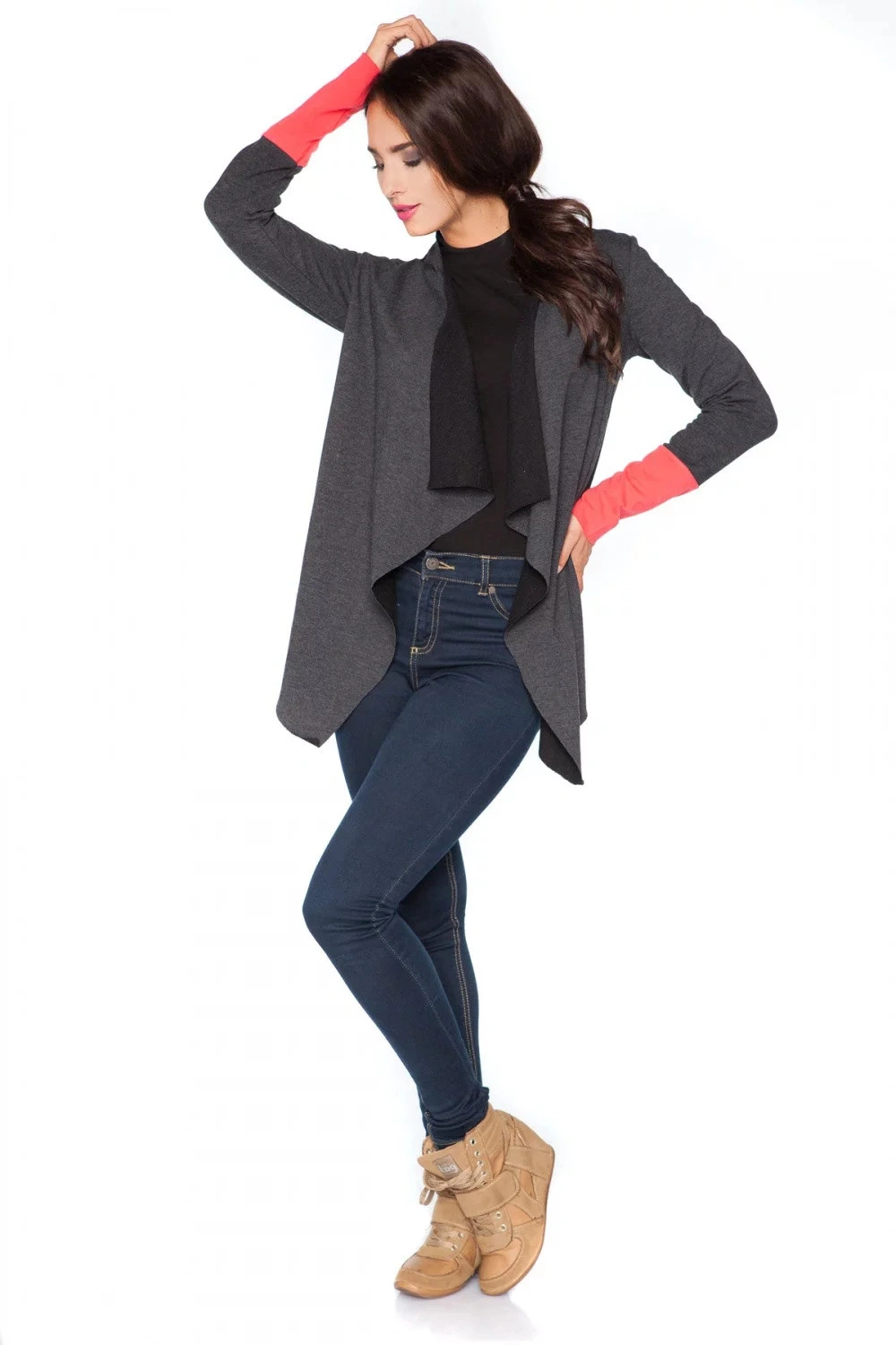 Mikina z pletené mikiny ponechaná vcelku. Rukávy zakončené manžetou v kontrastní barvě. Skvěle se hodí k džínům i k elegantním šatům.