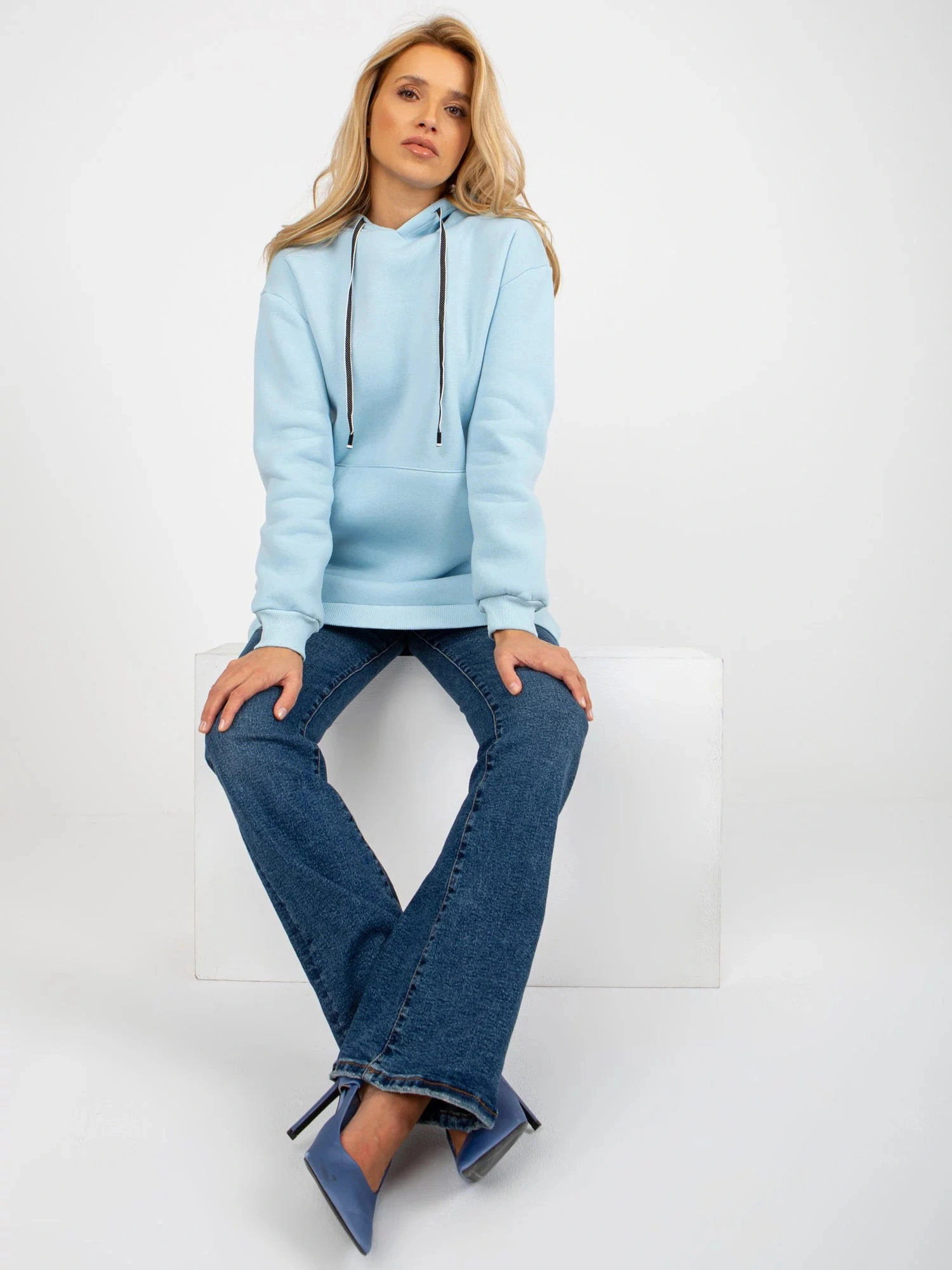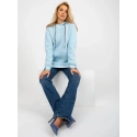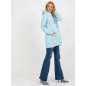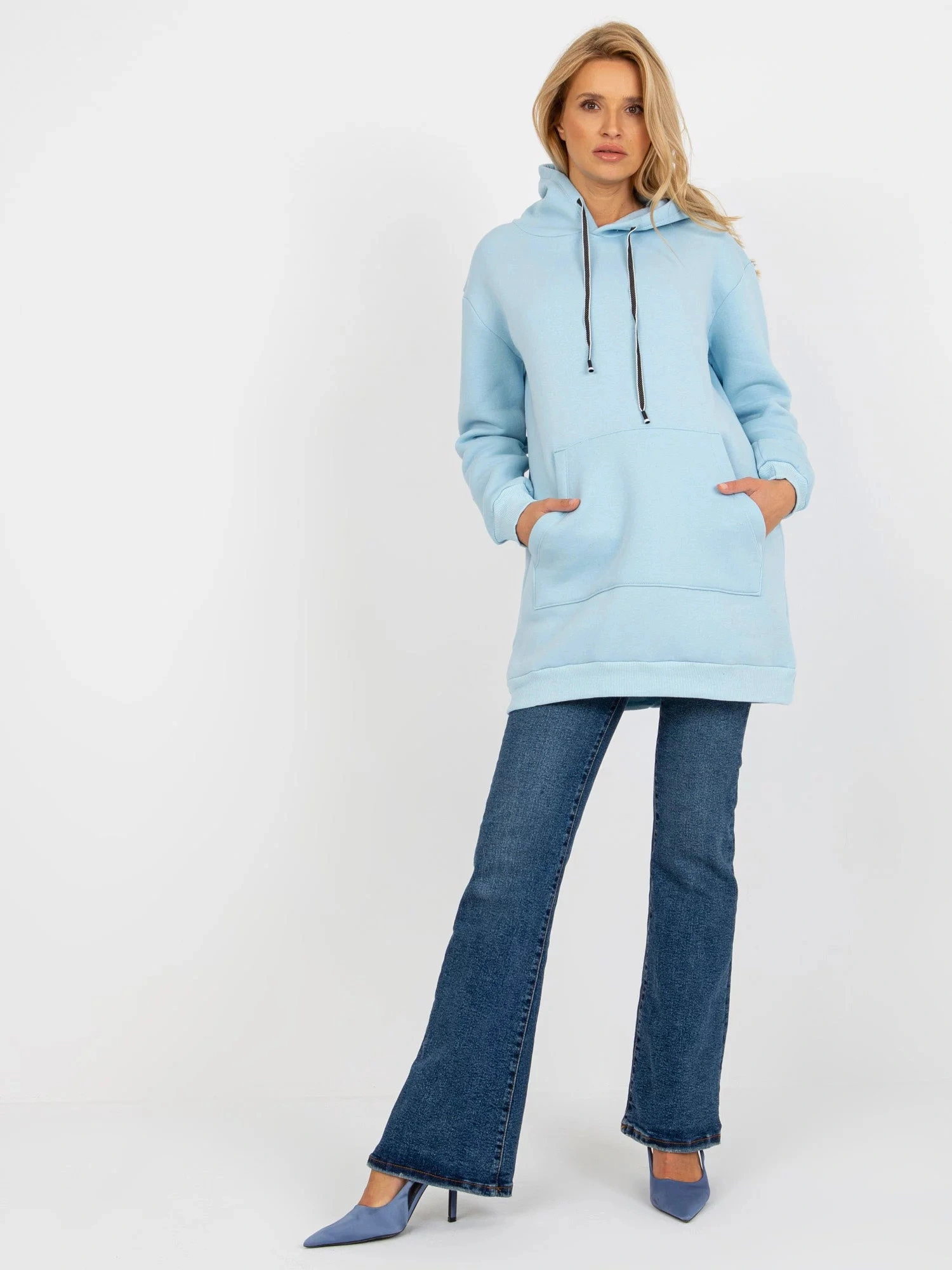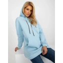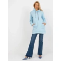 Světle modrá dlouhá mikina klokanka s kapucí .