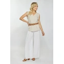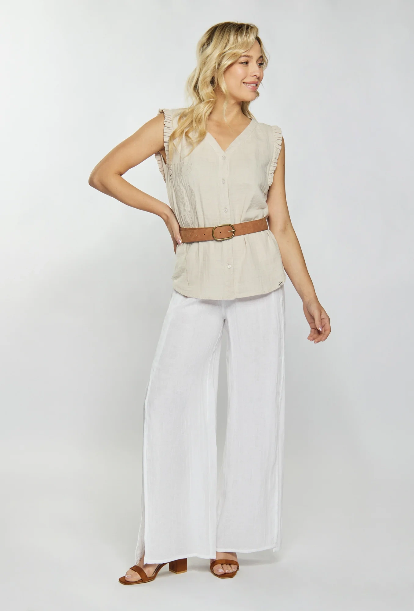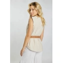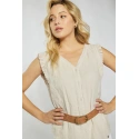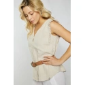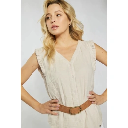 Dámská mušelínová halenka z měkké bavlněné tkaniny. Halenka visela na širokých ramínkách s volánky a výstřihem do V. Halenka se zapíná na knoflíky. Tento model bude skvěle fungovat téměř v jakékoli stylizaci. Modelka na obrázku je 177 cm vysoká a má velikost 36.