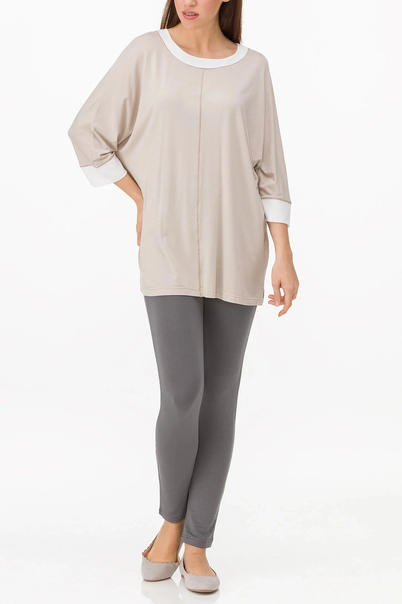 Dámské pyžamo sestávající z halenky a šortek. Halenka s dlouhými rukávy a špičatým výstřihem. Krátké