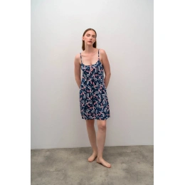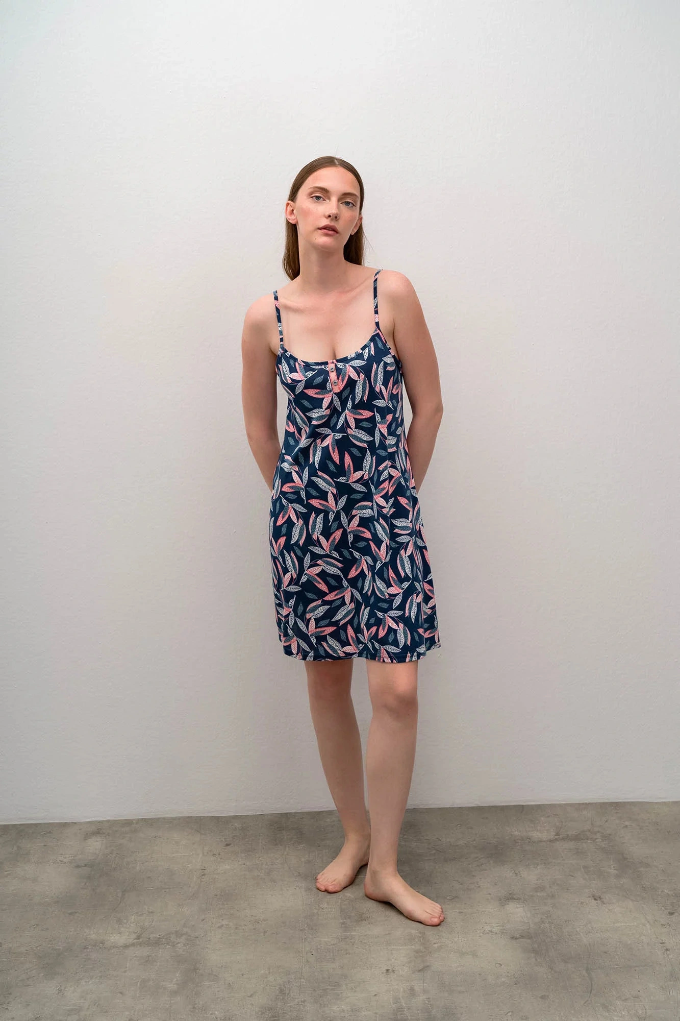 Dámská noční košile na ramínka, kruhový výstřih, u krku ozdoba - dva knoflíky.